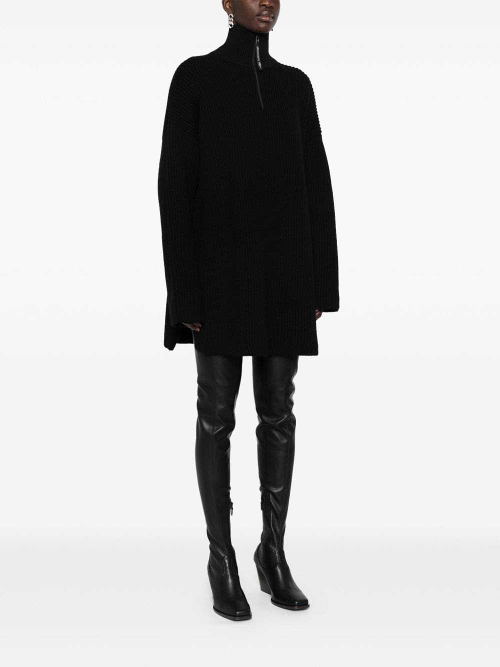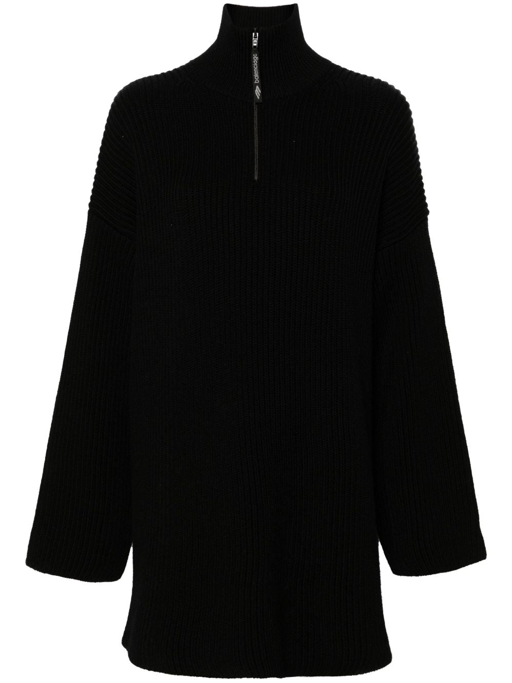 black wool ribbed knit appliqué logo to the rear mock neck short front zip fastening drop shoulder long sleeves side slits straight hem
