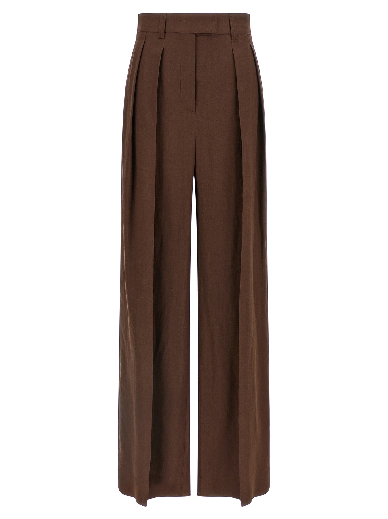 Linen blend trousers, formal model, mid waist with double front pleats, front stretched pleat, zip and hook closure, pockets.
