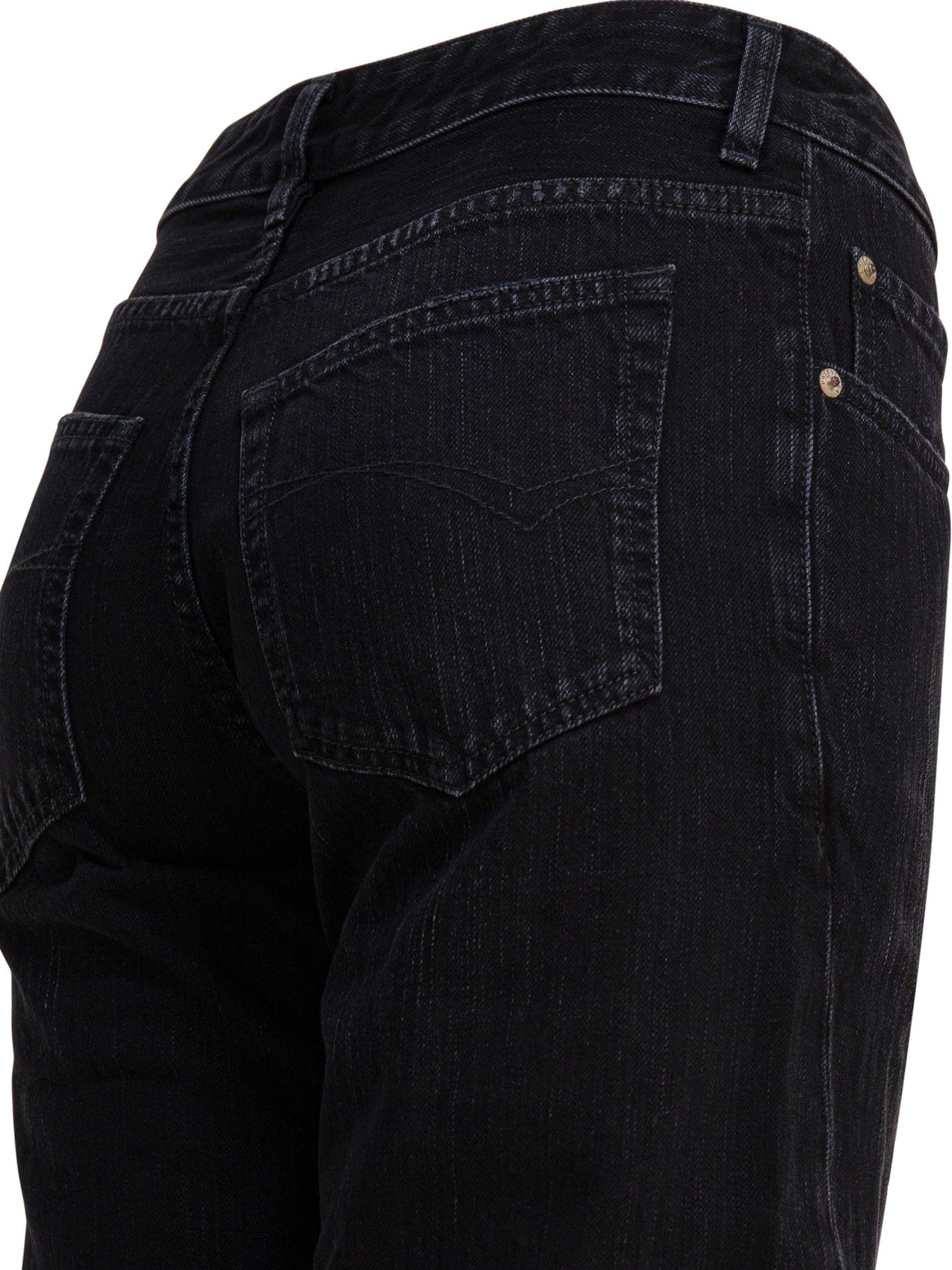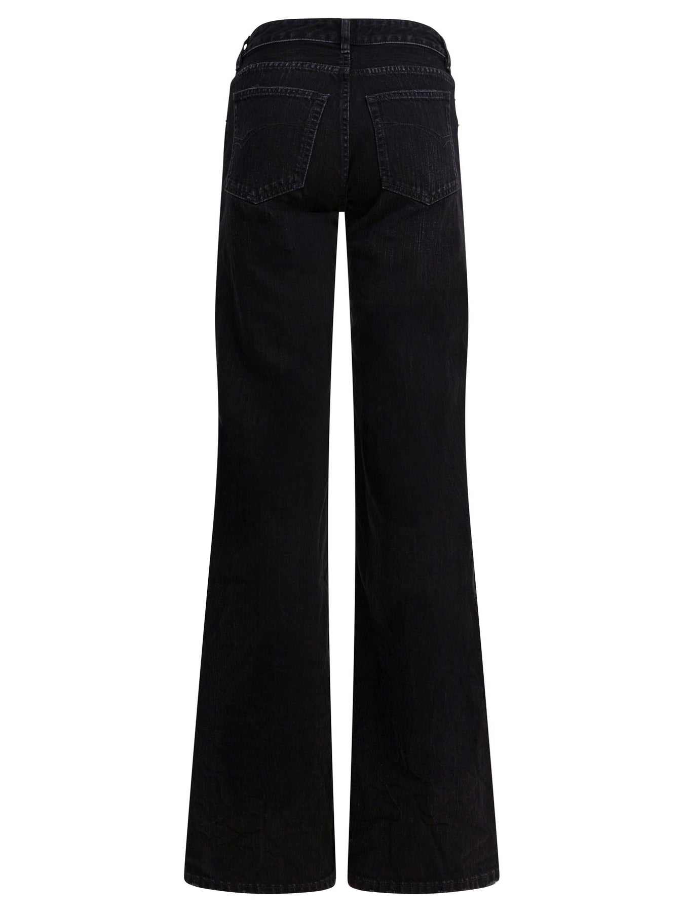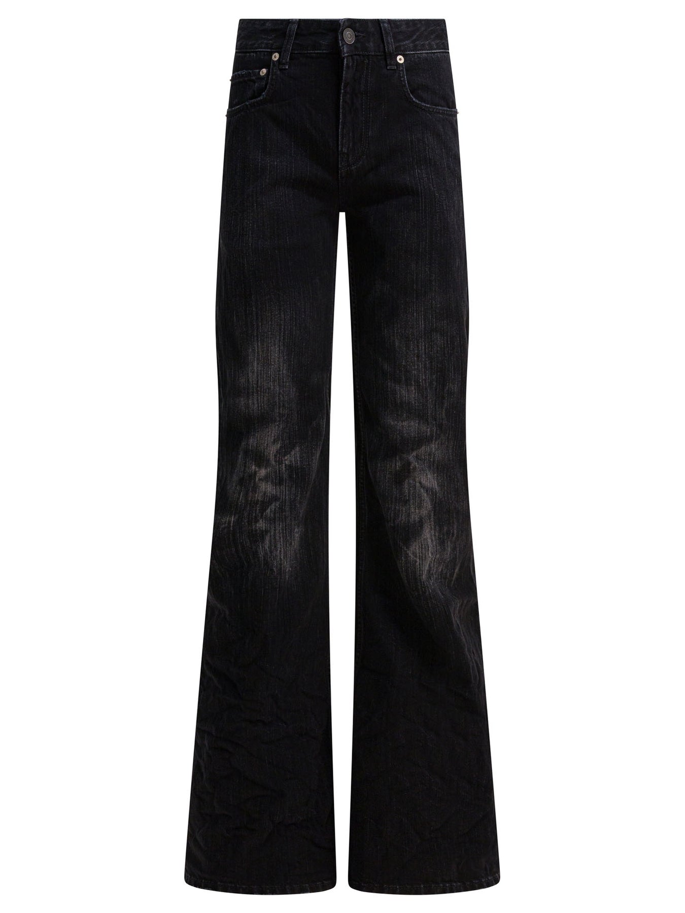 Balenciaga wide-leg jeans made of cotton denim with a washed and worn effect treatment. The surface shows a wrinkled treatment that gives an irregular texture. The construction includes a mid-rise structure, concealed zipper flap and presence of five belt loops at the waist. The model features a wide silhouette, five patch pockets and tone-on-tone stitching. || - Mid-rise - Washed and worn effect - Wrinkled effect - Hidden zipper flap - Five belt loops at the waist - Five pockets - Relaxed fit