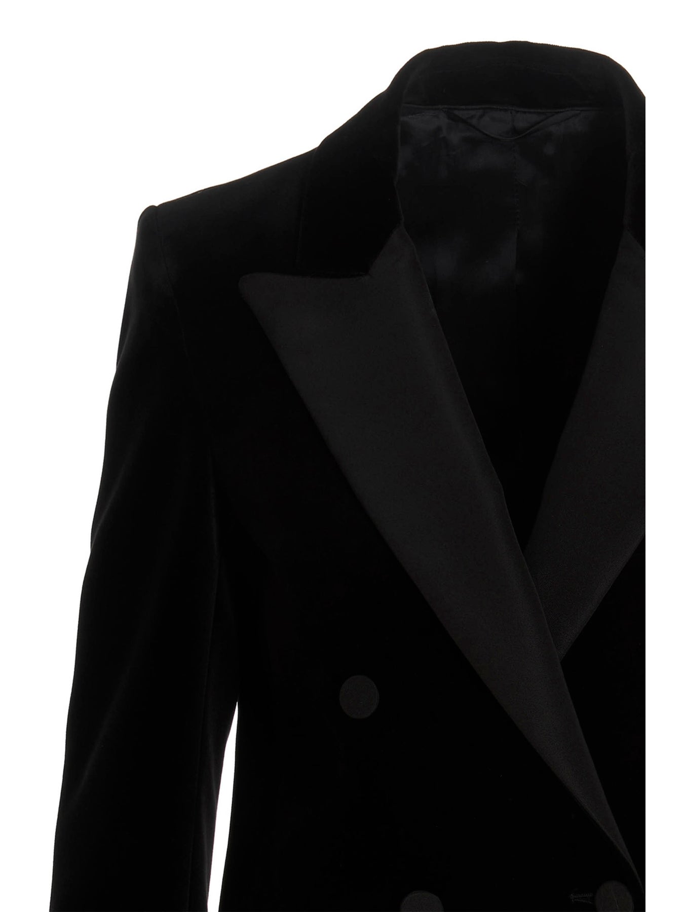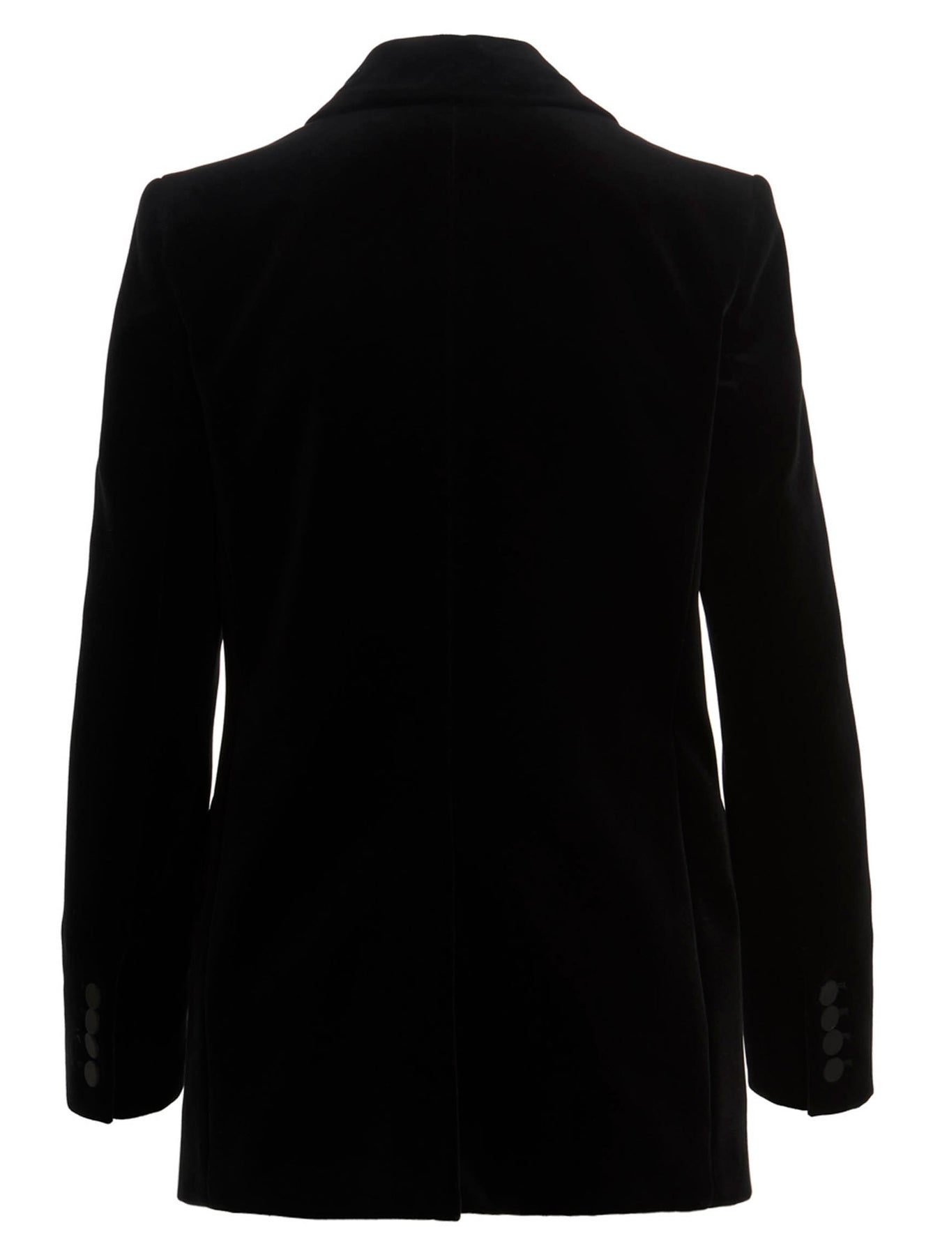 'Jealousy Everyday' double-breasted velvet blazer with satin details, front button closure, peak lapels, breast pocket, 'Smiley' pockets, long sleeves, padded shoulders, back split, monogram viscose lining.