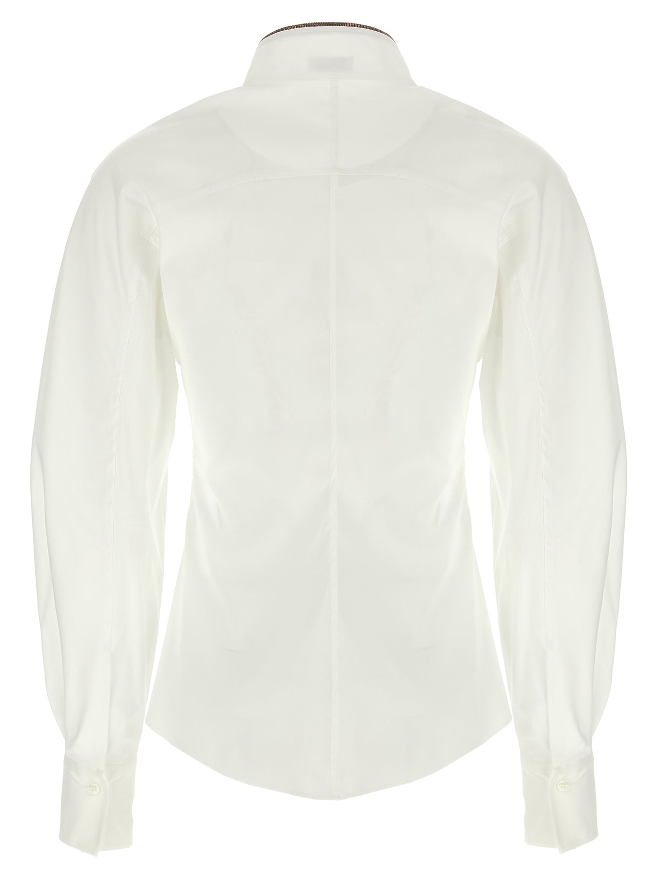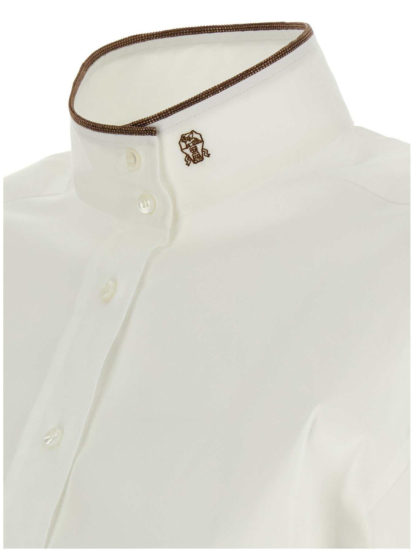 Stretch cotton poplin shirt, high collar with jewel 'Shiny Collar Detail' and logo embroidery, front button closure, long balloon sleeves with cuffs.