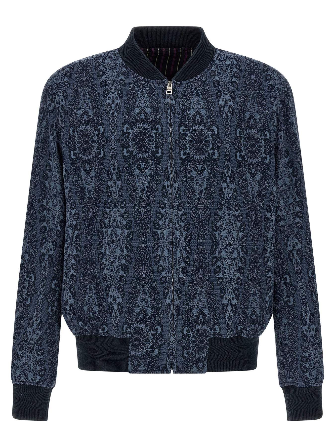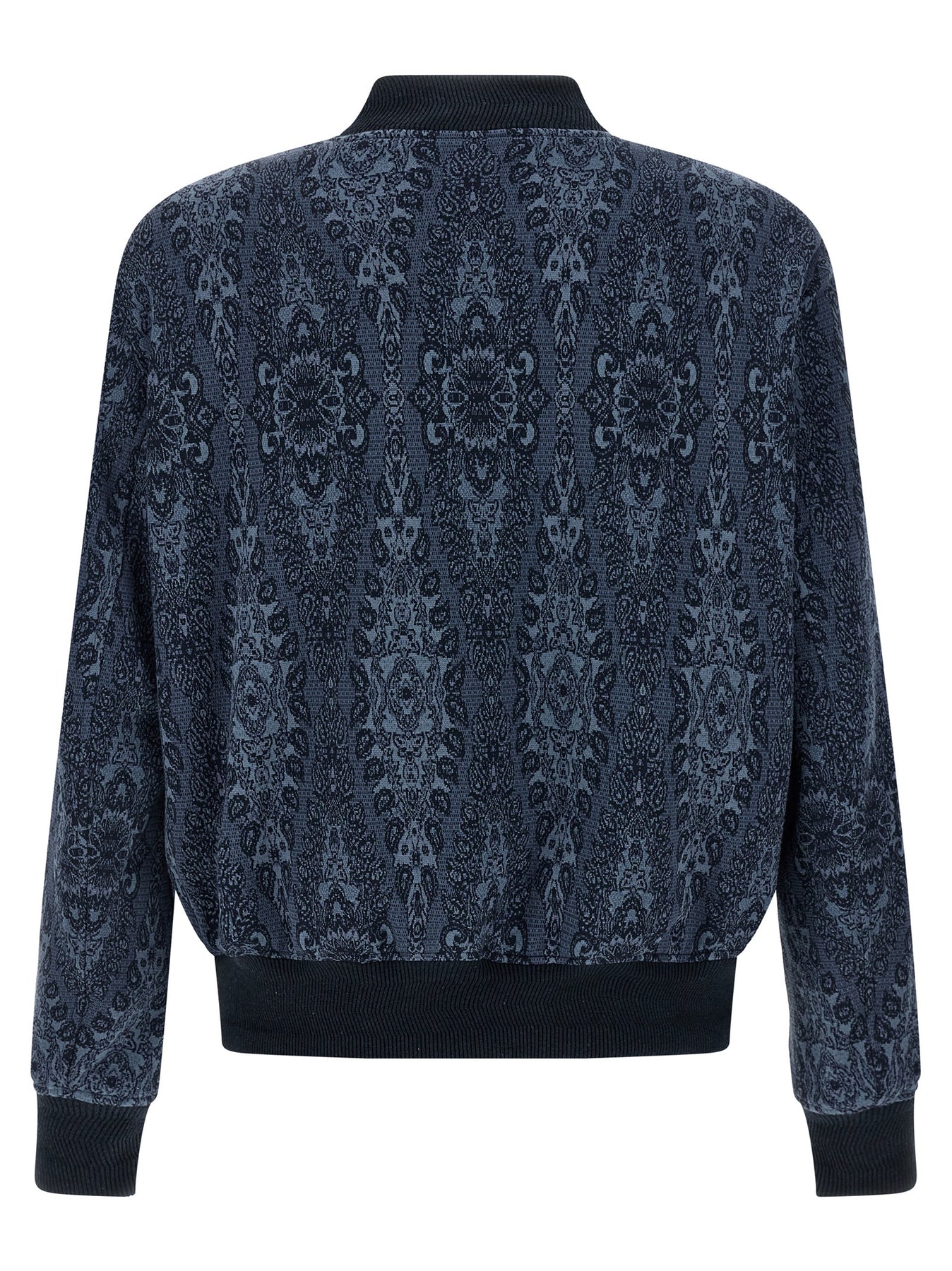 Jacquard cotton and viscose blend bomber jacket with ribbed cotton knit inserts, zip closure, pockets, long cuffed sleeves.