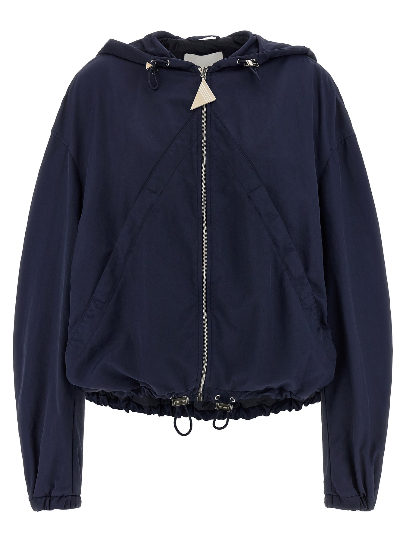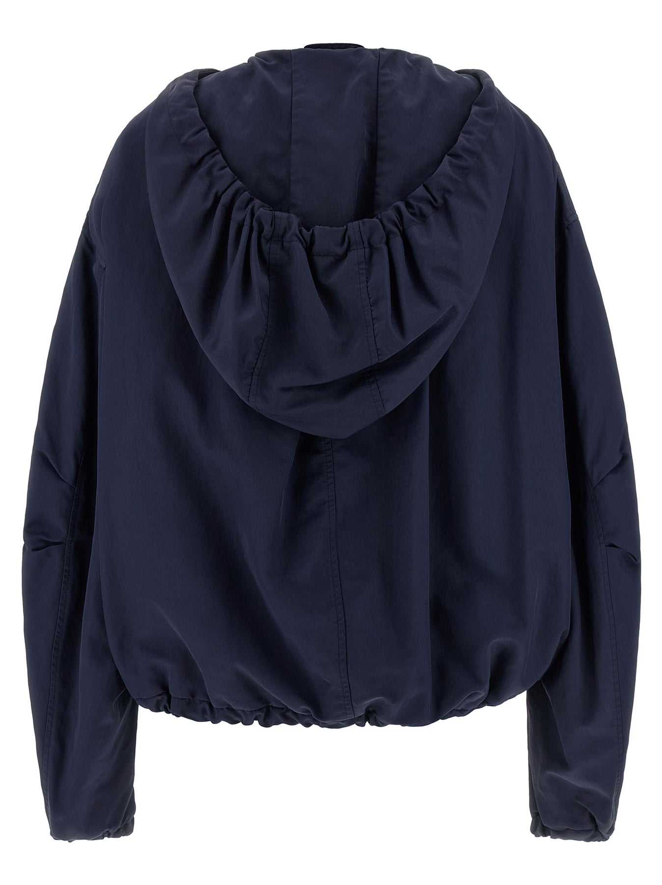 Overdyed nylon hooded bomber jacket, front zip closure, pockets, wide long sleeves with elastic cuffs and dropped shoulder, drawstring on the hem, technical fabric lining.