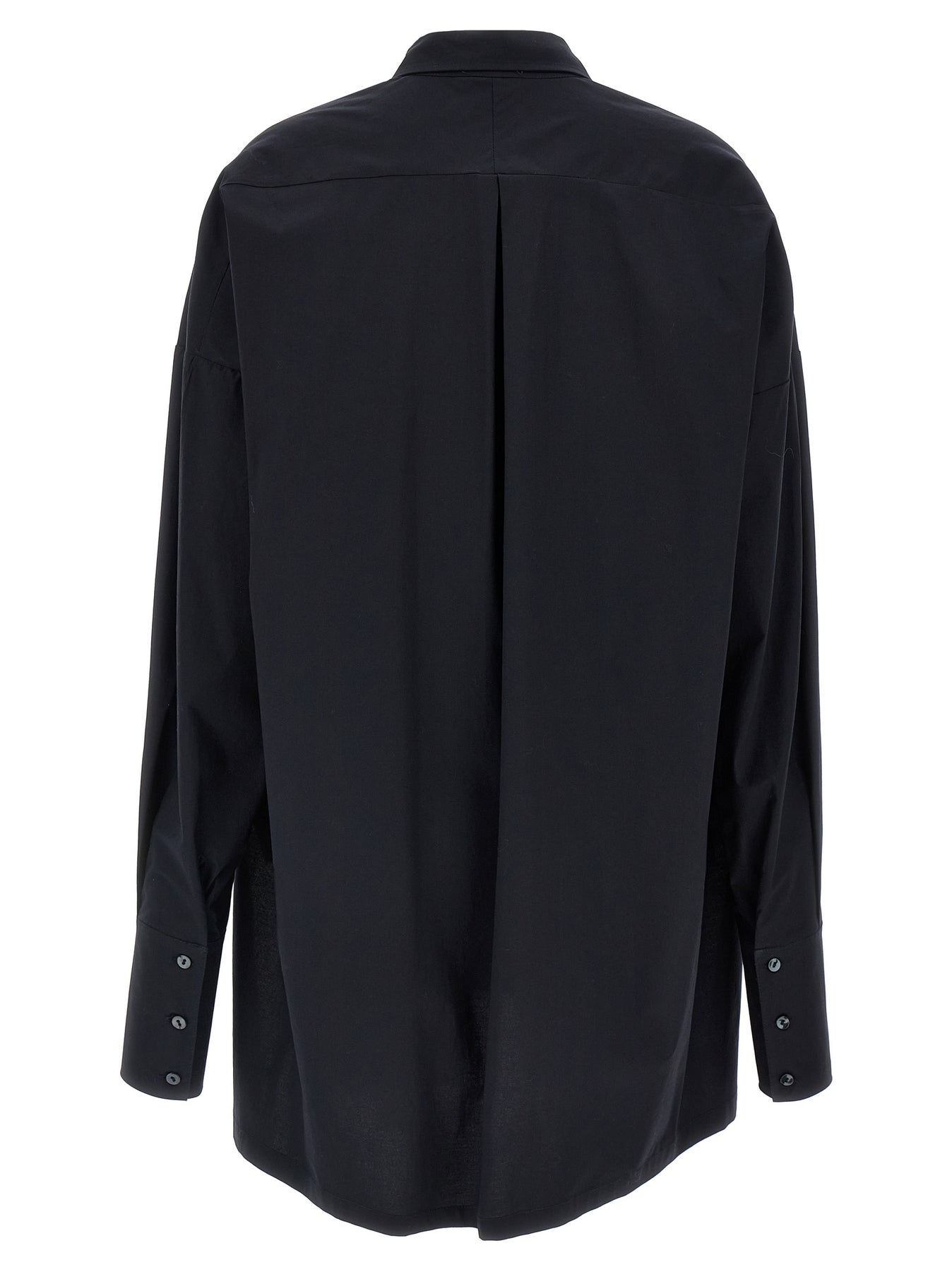 Cotton shirt, collar and buttons, long sleeves with cuffs and dropped shoulder, side slits. Coloring: dark blue