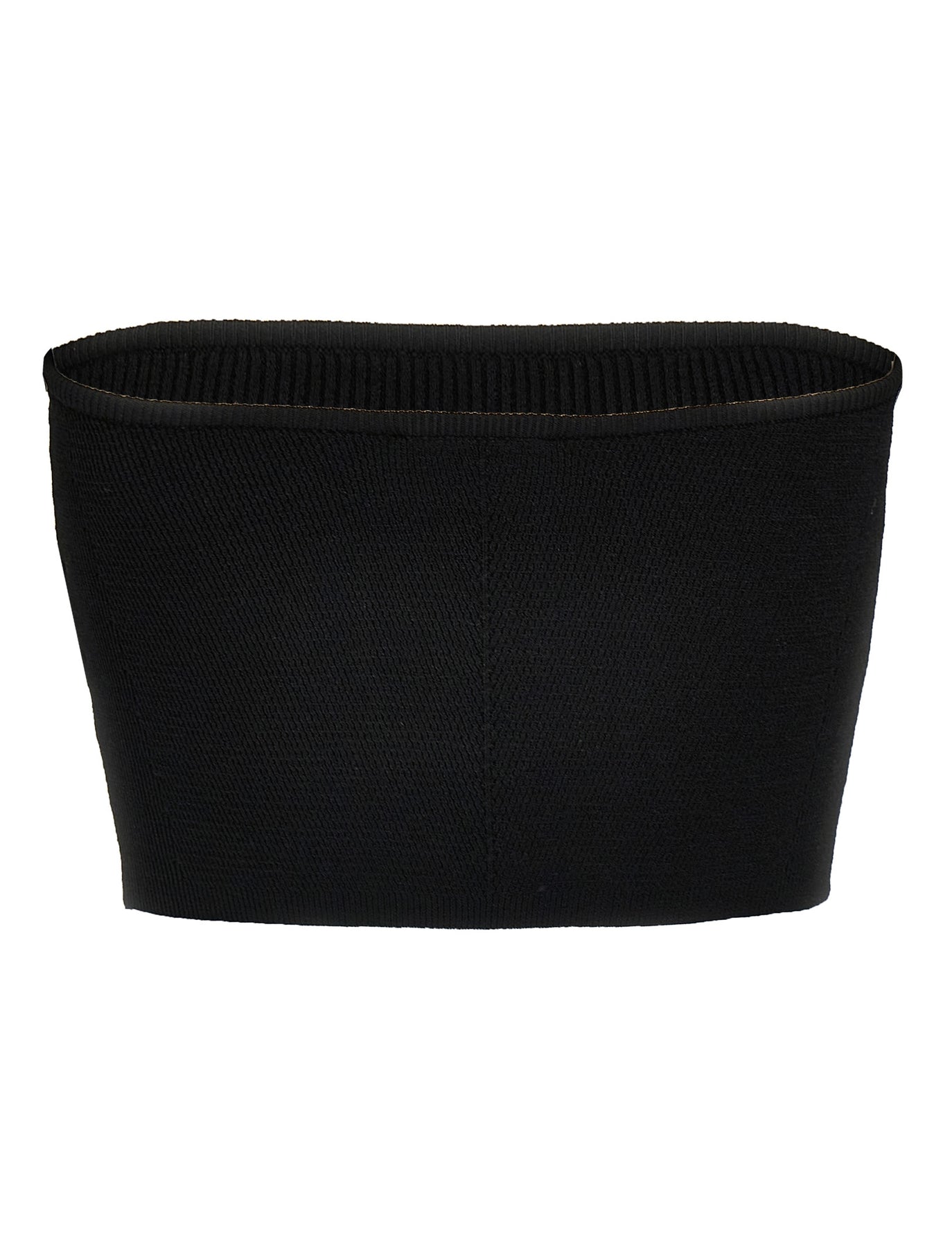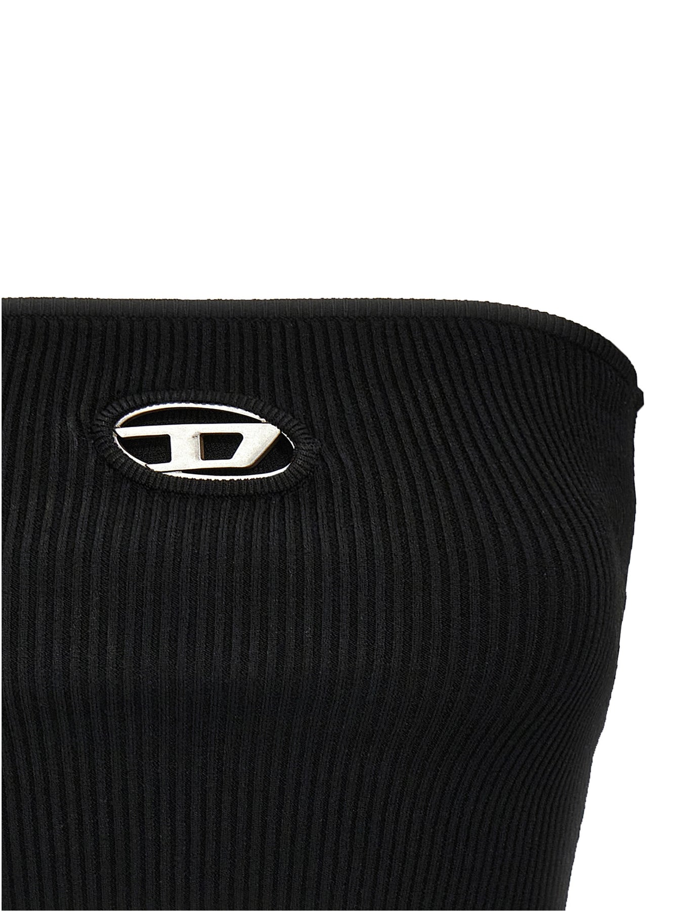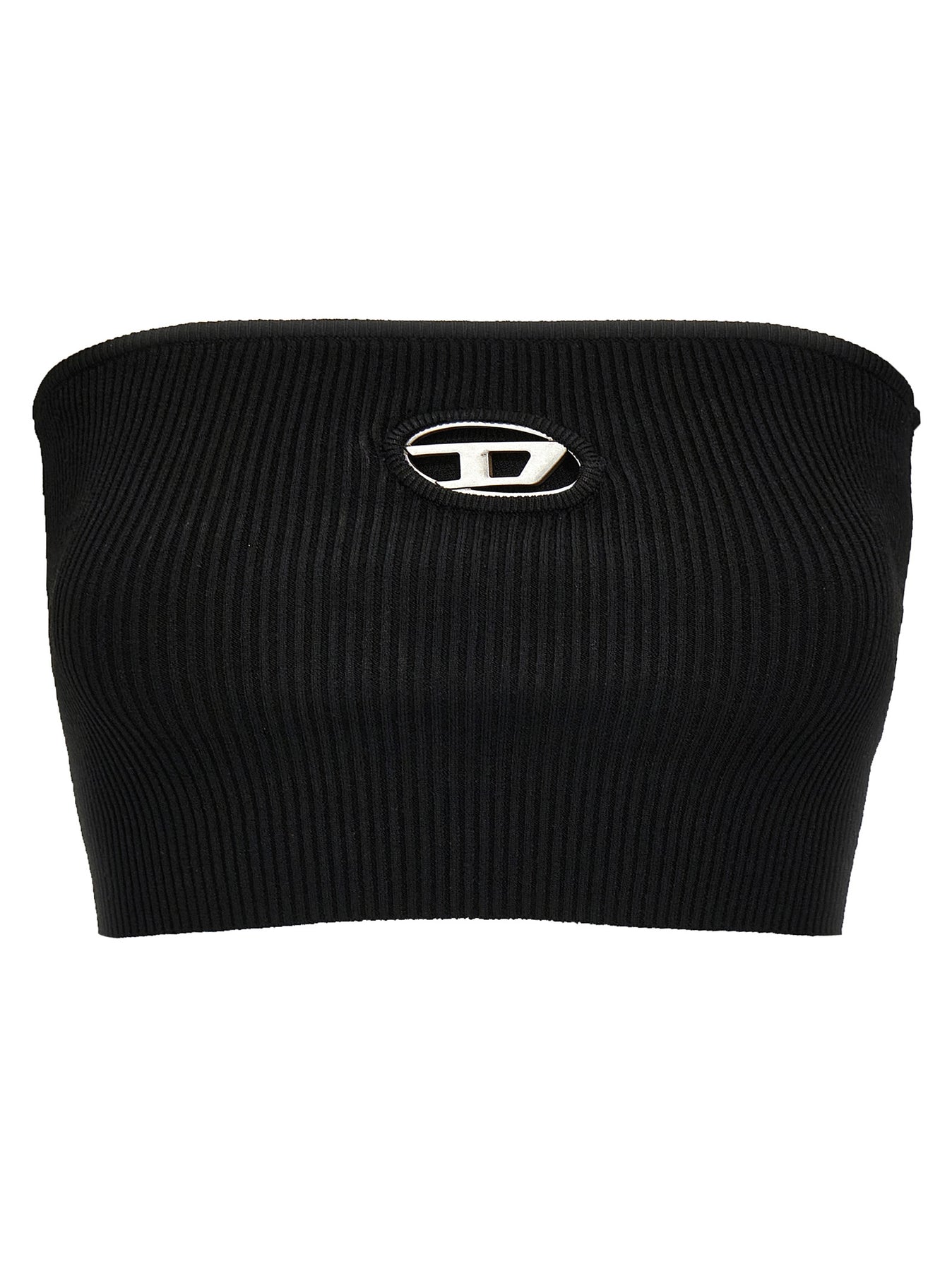 'M-Clarksvillex' ribbed stretch jersey top with front metal logo plaque with cut-out detail, off-the-shoulder bandeau design.