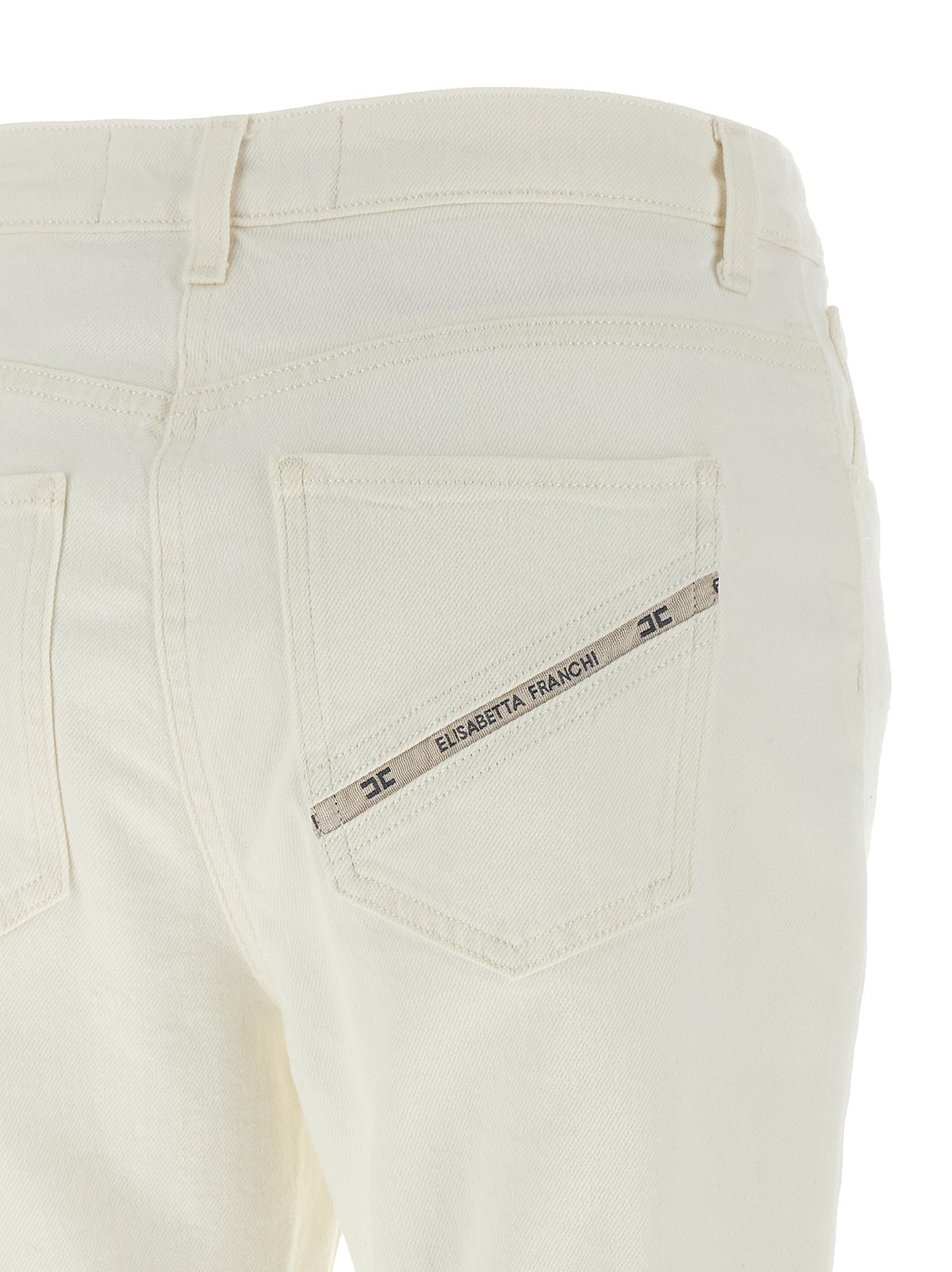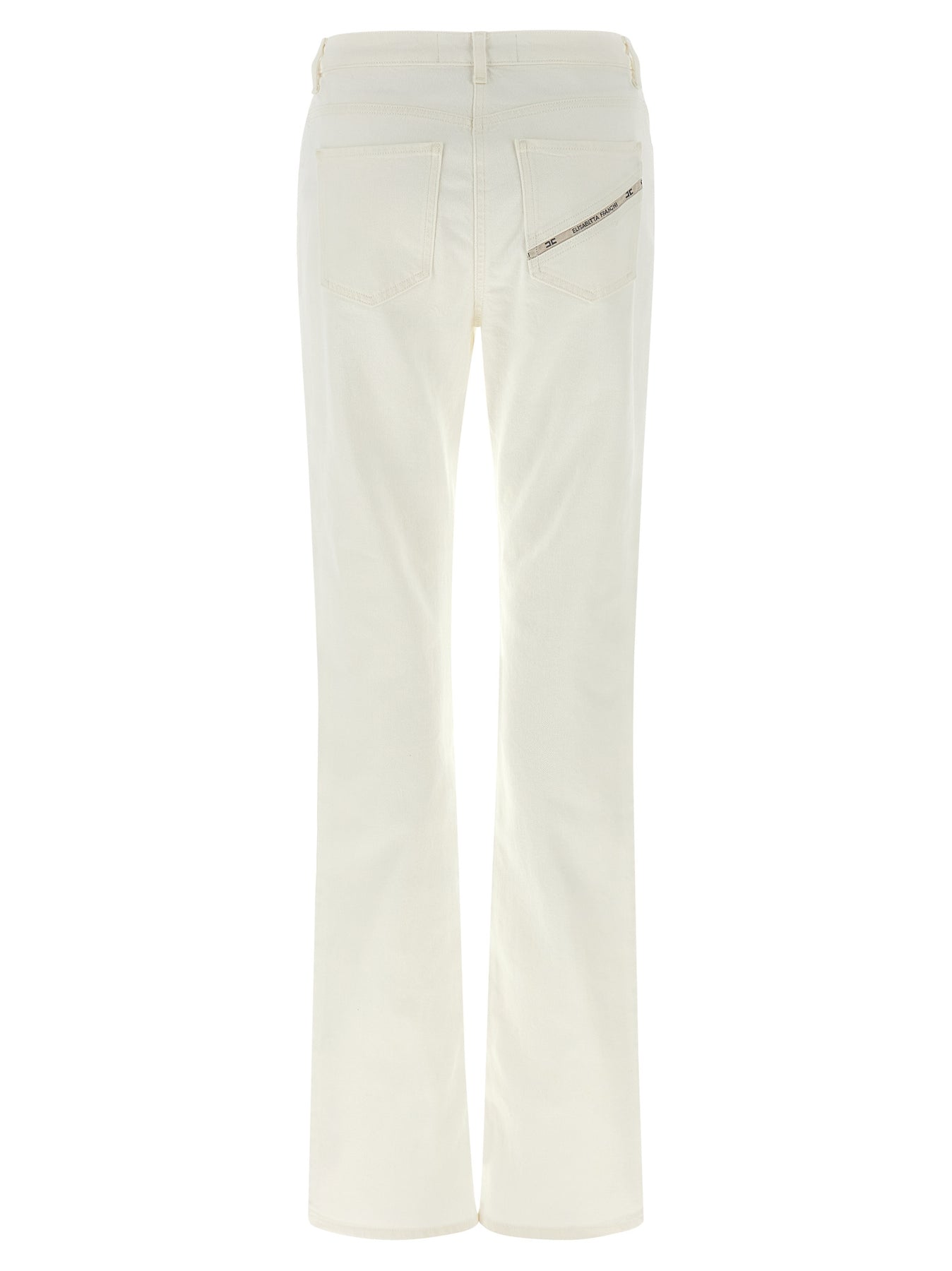 Garment-dyed cotton denim jeans, front metal jewel padlock detail, mid waist, zip and button closure, five pockets.