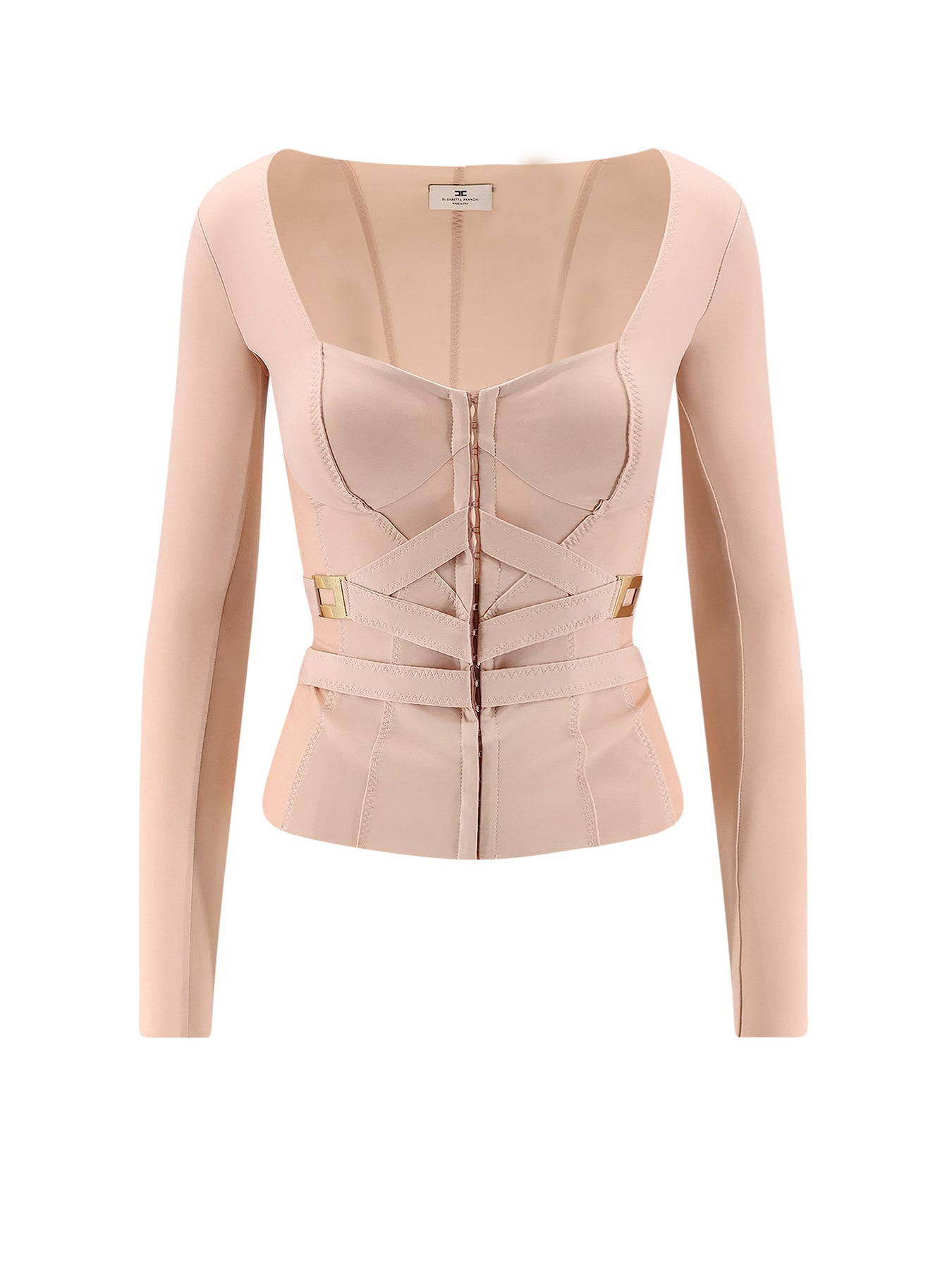Hooks closure and long sleeves Elasticized straps with gold metal details Lined cups Made in Italy 75% polyamide 25% elastane SKU: GI16056E2EA1