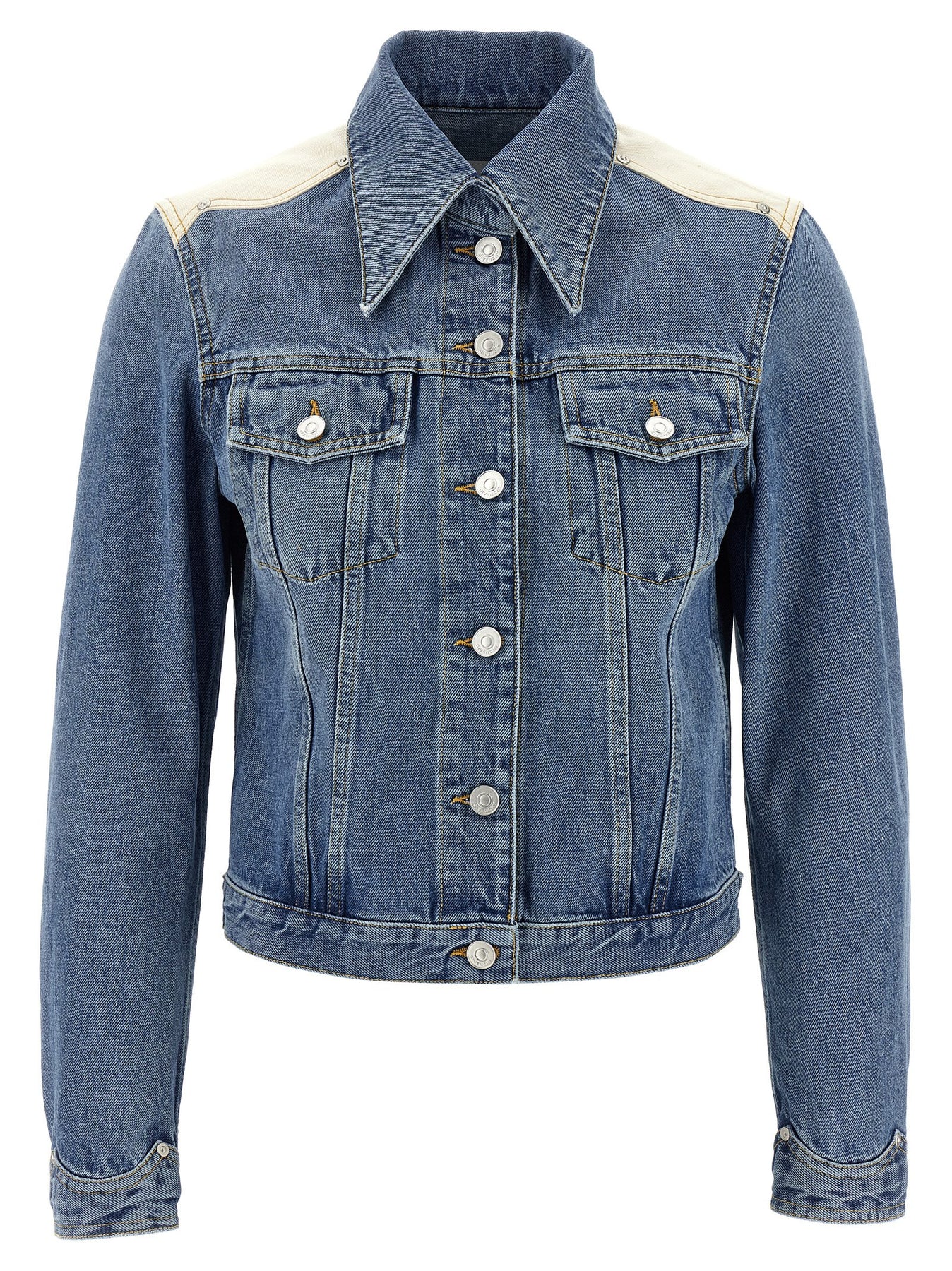 Cotton denim jacket with canvas top detail, front button closure, pockets, long cuffed sleeves.