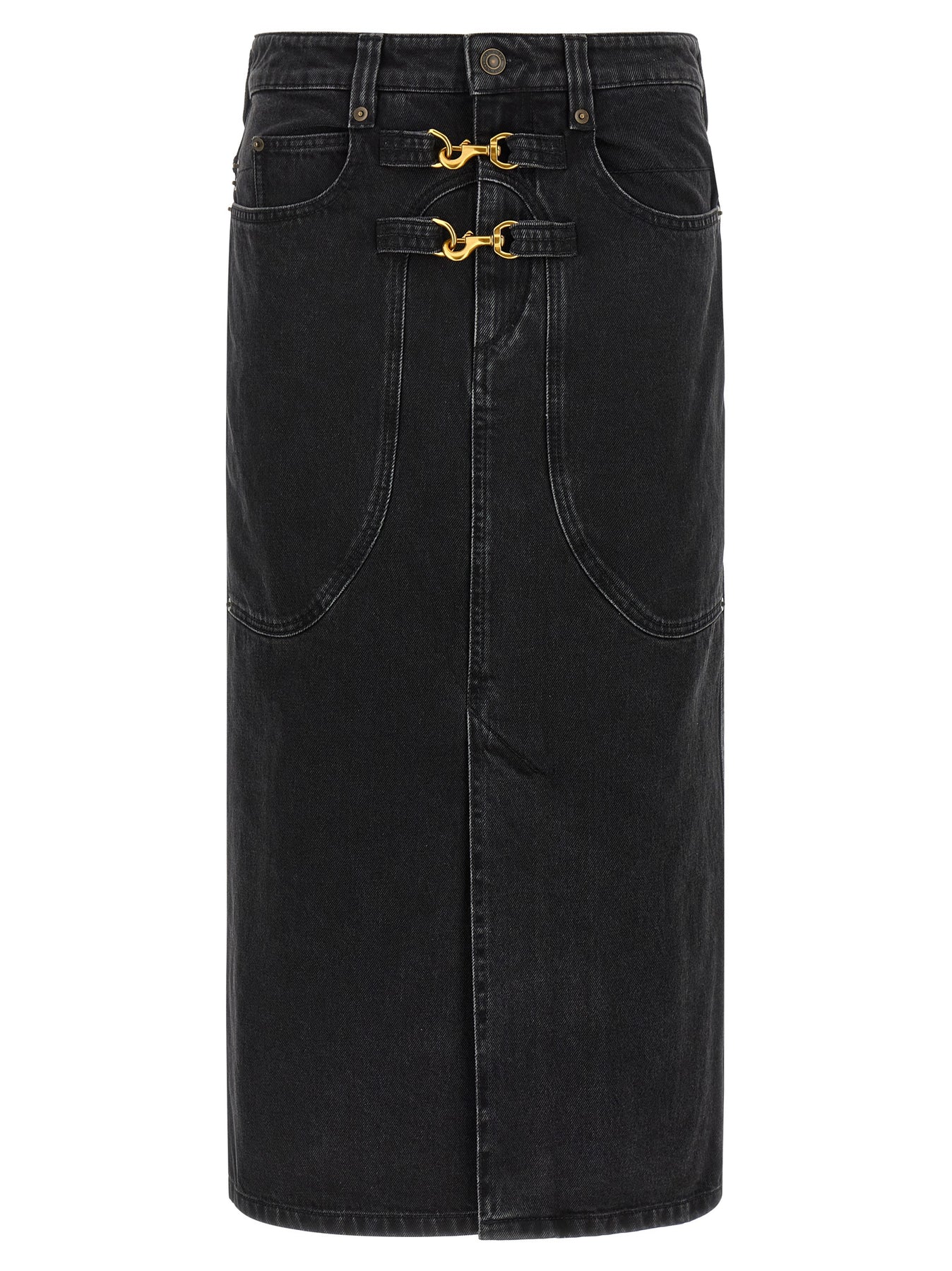 'Pavina' midi skirt in cotton denim, longuette model with carabiner detail, zip and button closure and front split, high waist, five pockets, back logo tag.