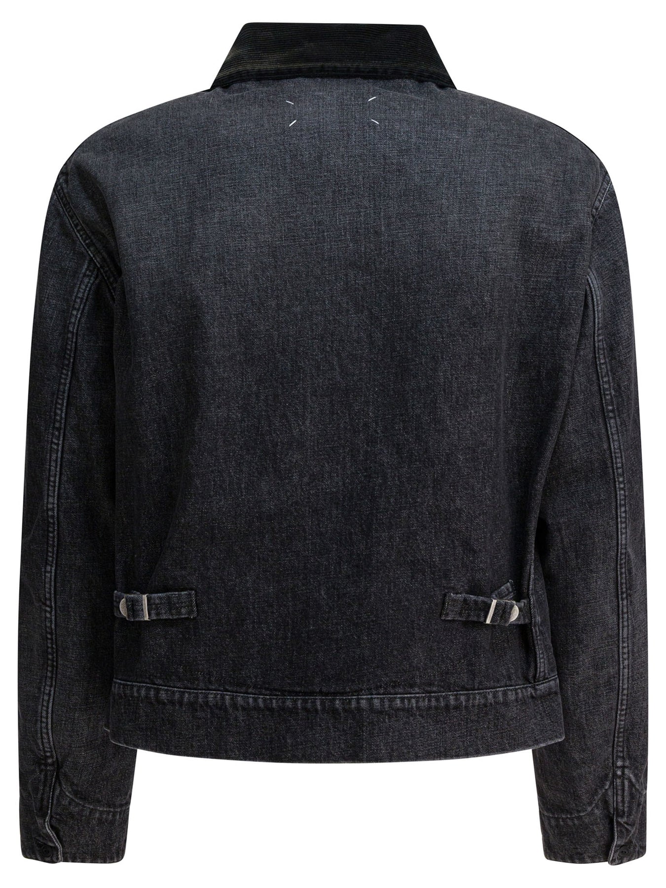 Maison Margiela denim jacket made from Japanese cotton denim, featuring a workwear-inspired construction. The construction features two slanted welt pockets and a zip-and-loop patch pocket on the chest. Visible on the back are the brand's four distinctive seams instead of the traditional label. || - Solid color - Japanese cotton denim - Two front welt pockets - Zipper and loop chest pocket - Front zipper closure - Four stitches on the back - Boxy fit