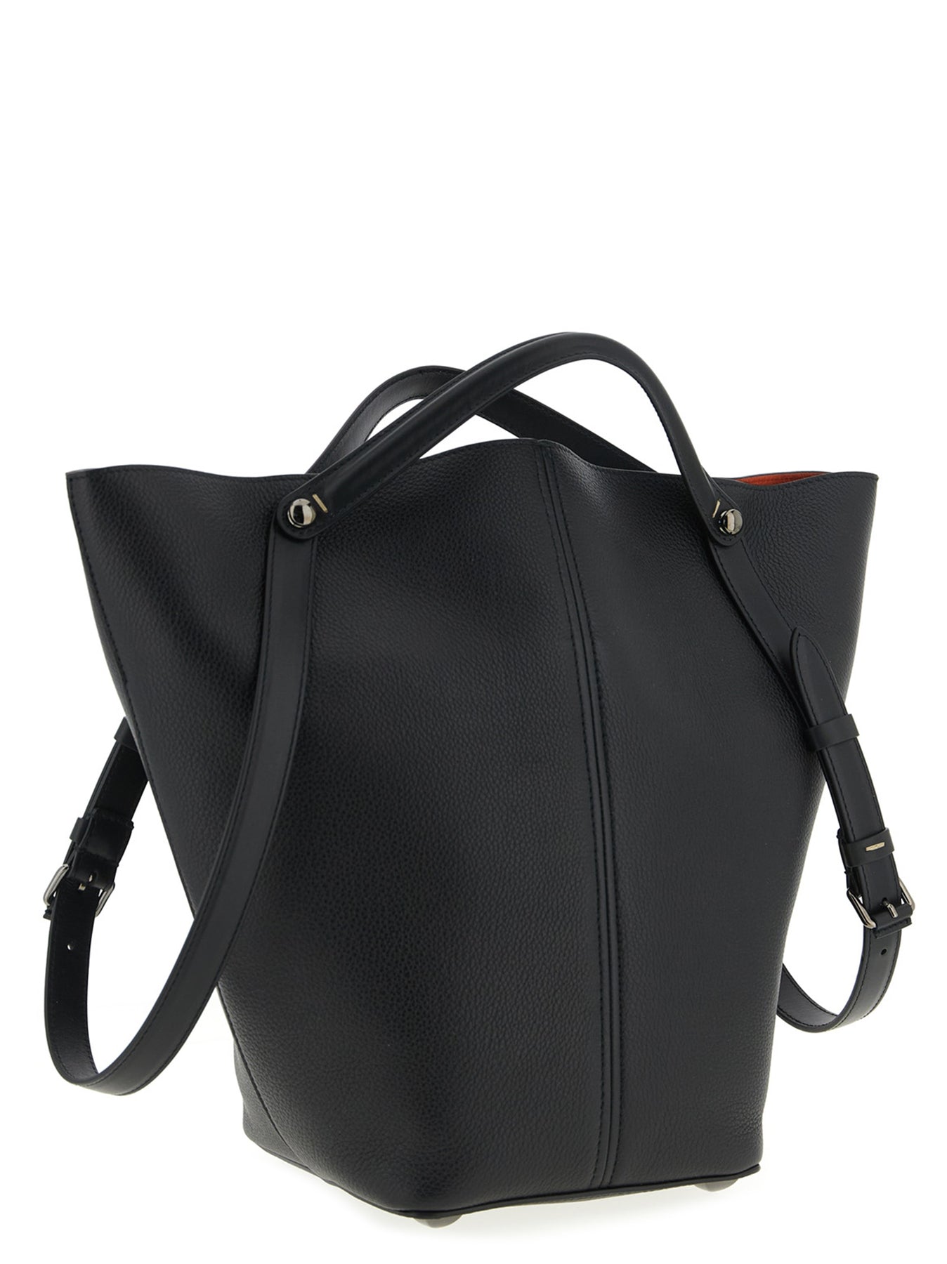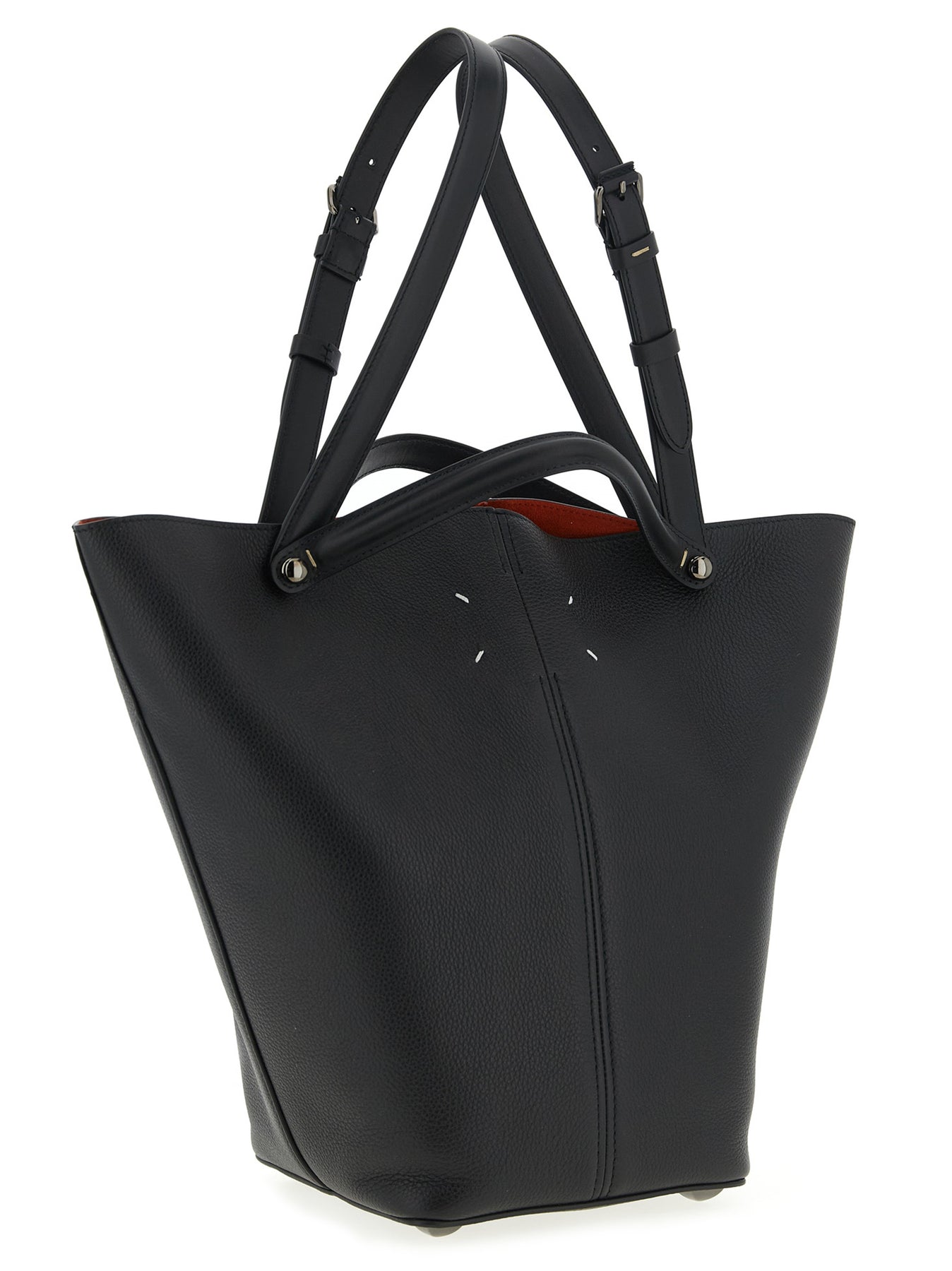 Medium 'Dress-age' hammered calf leather handbag with trapezoidal silhouette, magnetic closure, double fixed short handle, double adjustable shoulder handle, back 'Four Stitches', rigid base with metal feet, contrast suede lining.