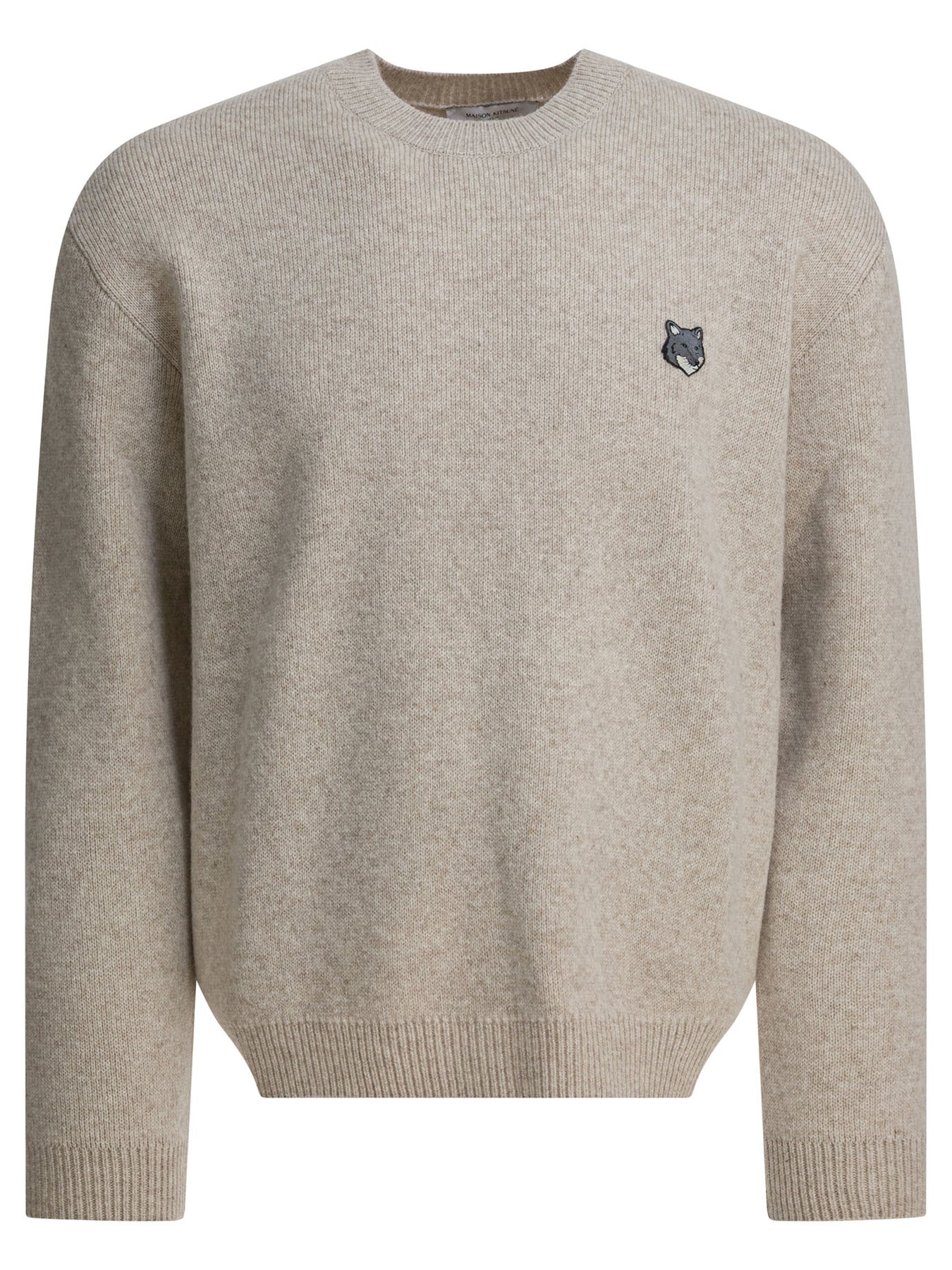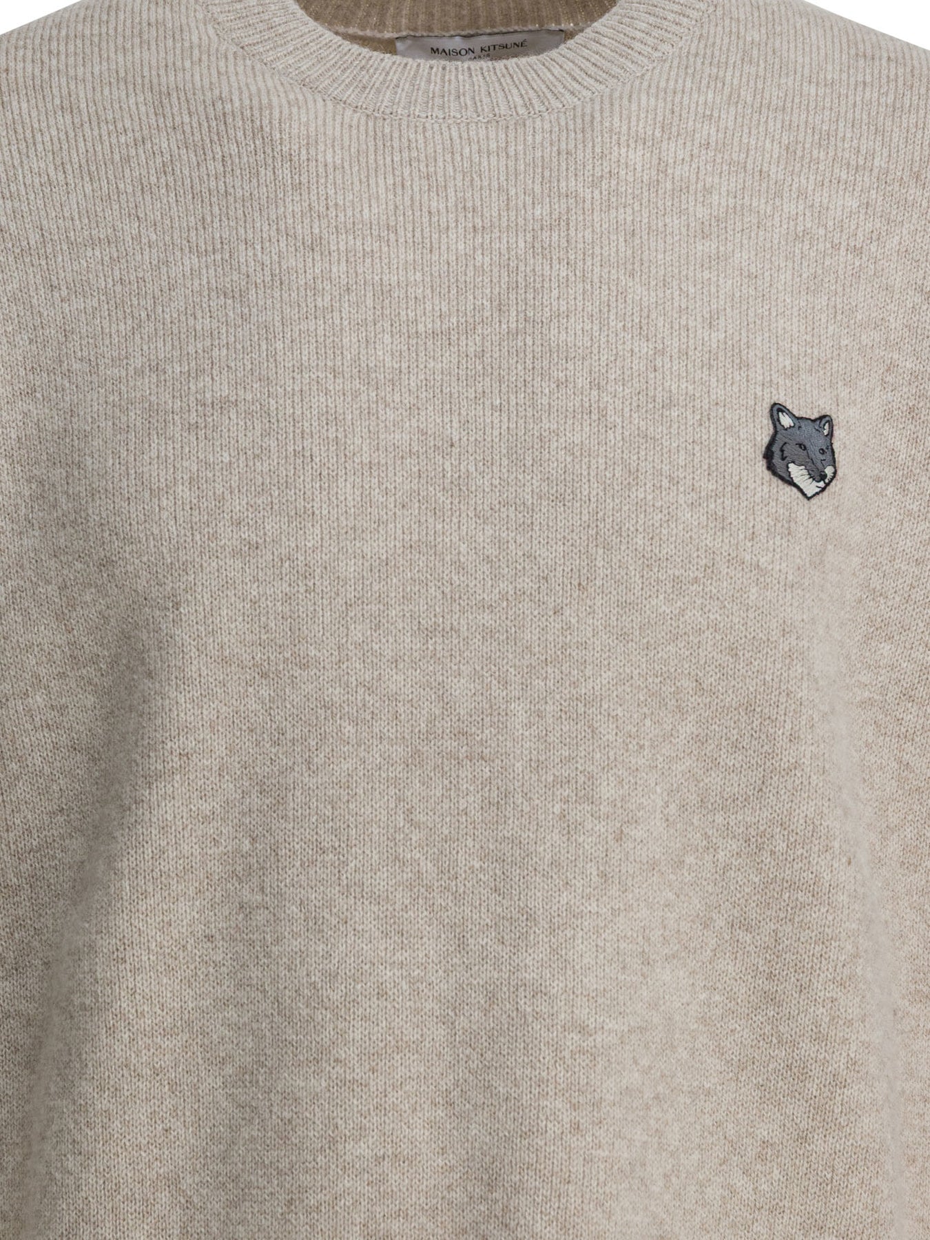 Maison Kitsuné wool crewneck sweater made from shaved knit. It features a long-sleeved construction and straight silhouette, with a crew neckline and ribbed finished edges. The Fox Head inlay on the chest identifies the product and is integrated into the fabric. The construction uses high-density wool yarn to increase the compactness of the knit. Seams are internal, with no additional decorative details. || - Fox Head logo inlaid on the chest - Long sleeves - Crew neckline - Ribbed edges - Wool knit construction - Regular fit