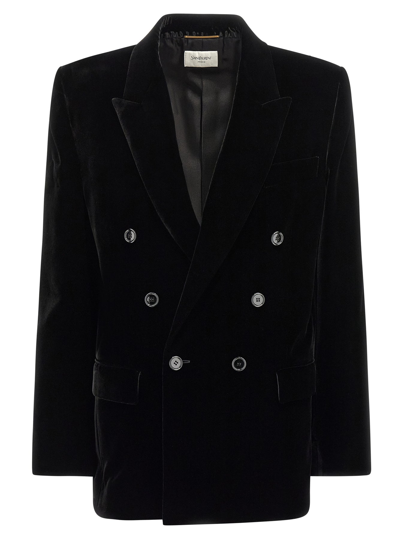 Double-breasted viscose velvet and cupro blazer with front button closure, peak lapels, chest pocket, flap pockets, inside pocket with tone-on-tone 'Cassandre' embroidery, padded shoulder, long sleeves, back split, and silk lining.