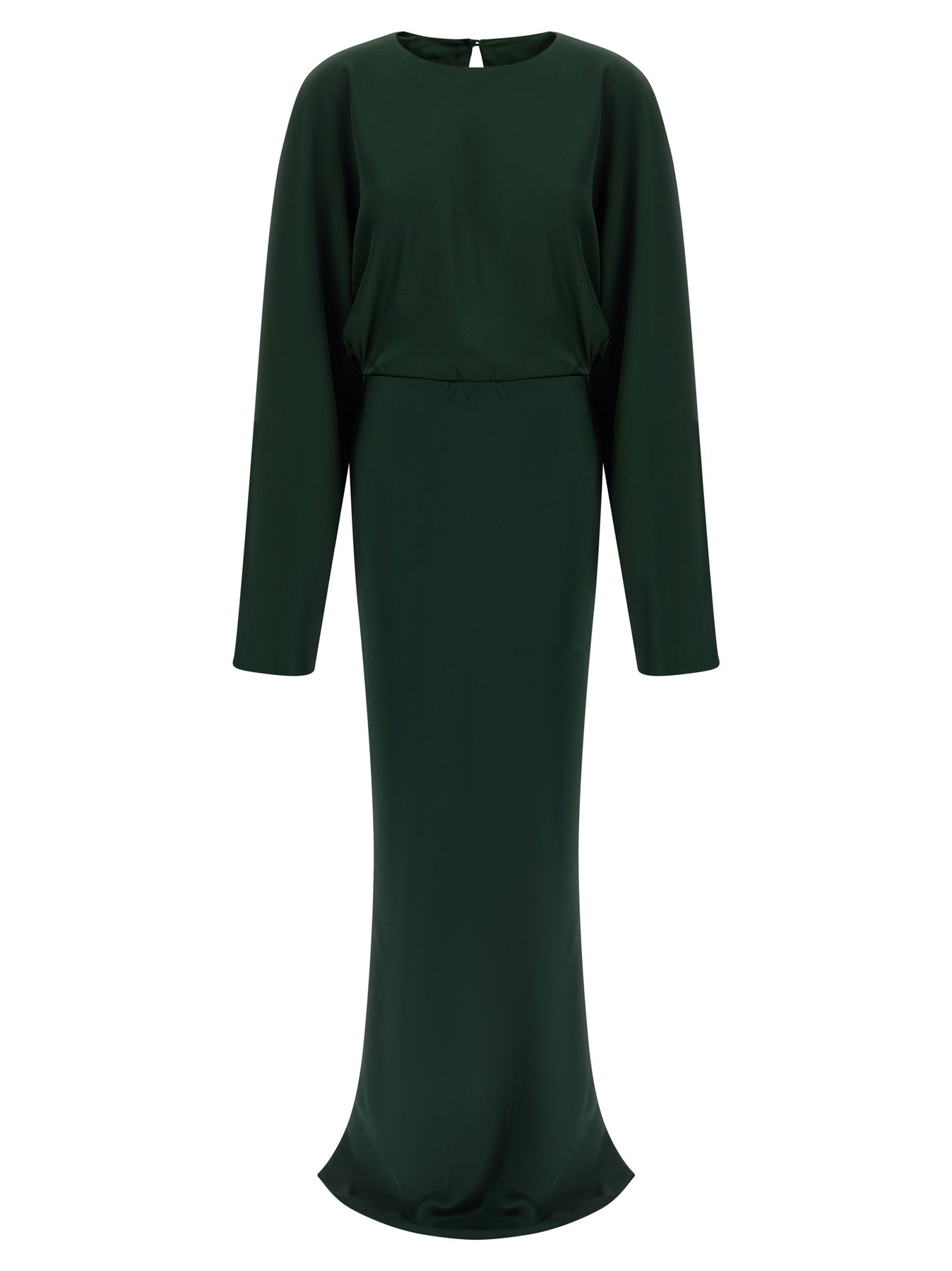 Long 'Reverse Obie' dress in crepe de chine with crew neck, back button closure, slightly bat long sleeves, slightly flared straight skirt at the bottom.