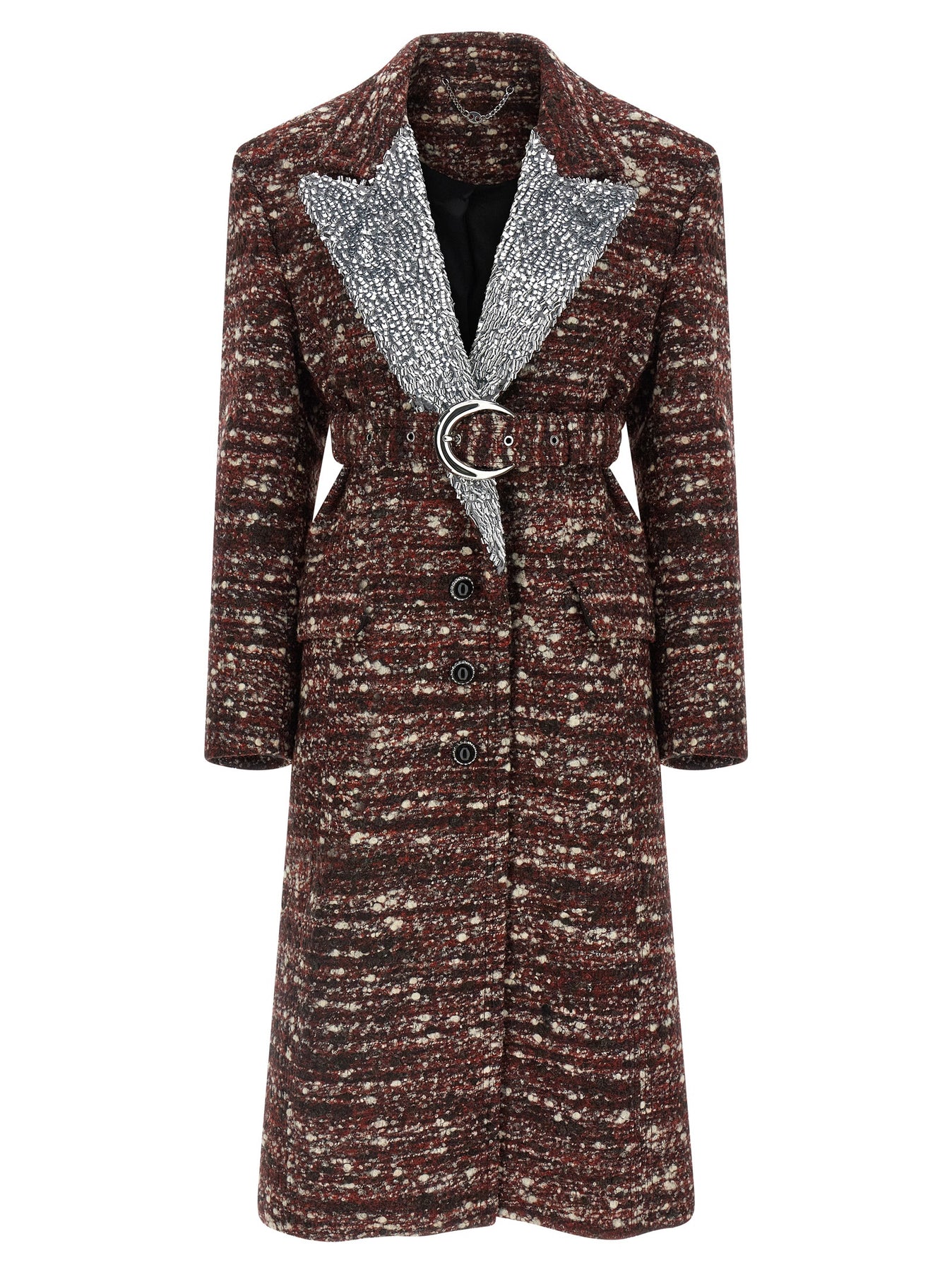 Bouclé wool single-breasted coat with front jewel button closure, peak lapels with sequin detail, breast pocket, flap pockets, structured shoulder strap, long sleeves, back split, viscose lining.