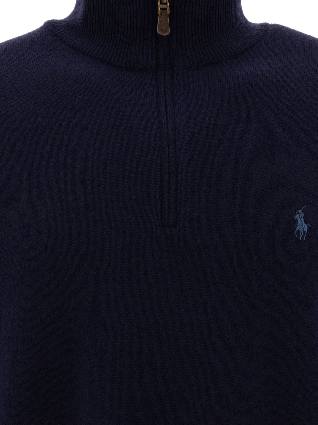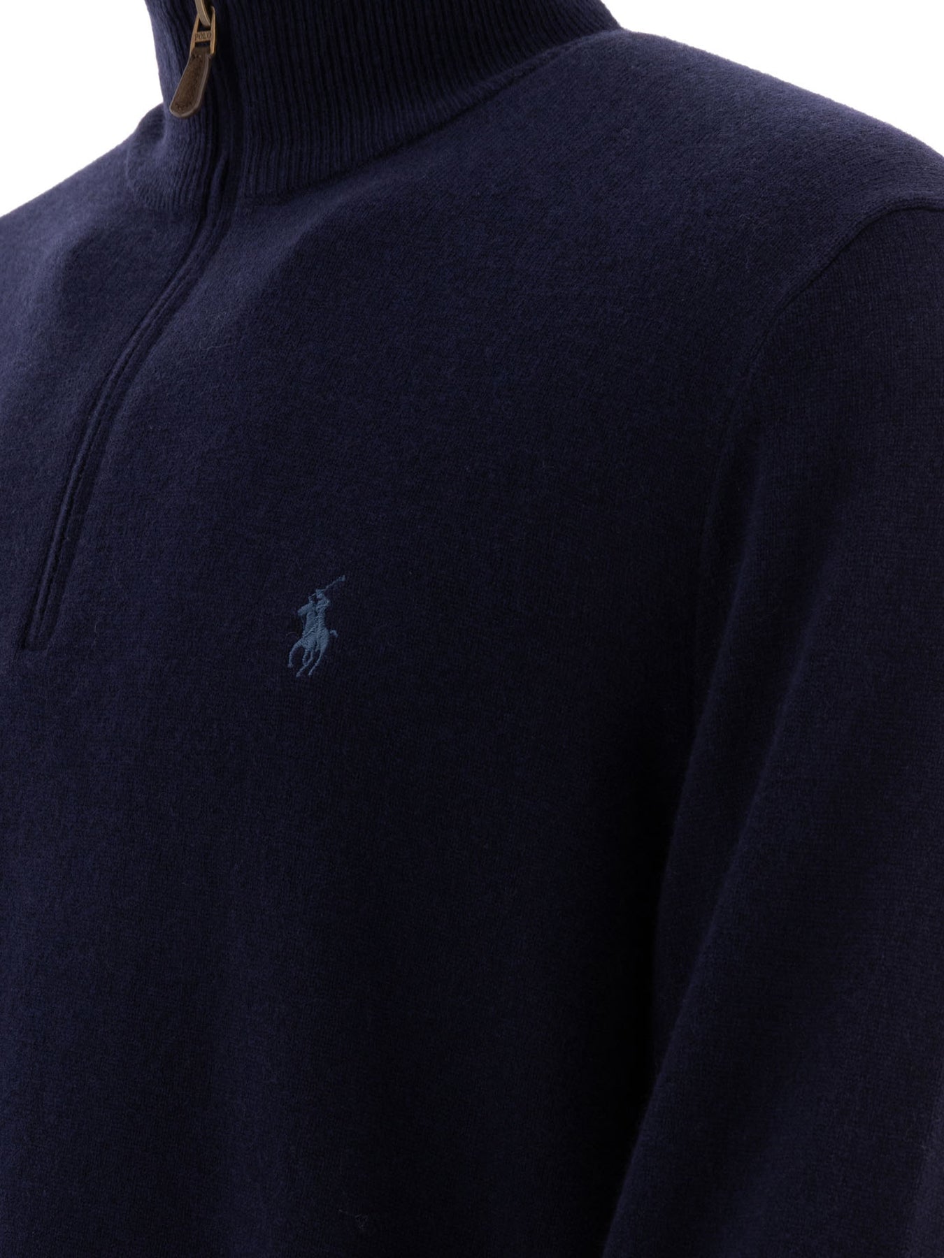 Polo Ralph Lauren wool half-zip sweater made from 100% wool fabric. The model features a regular-fit construction with a wide chest, ribbed knit mock neck and quarter zipper front. Suede zipper strip with engraved Polo logo, eco-friendly suede detail on the inside of the nape. Long sleeves with ribbed cuffs and ribbed hem complete the structure. || - Embroidered pony logo on the left side of the chest - Long sleeves - Mock neck with ribbed fabrication - Quarter zipper on the front - Polo logo suede zipper strip - Inside nape edge in eco-friendly suede - Ribbed cuffs and hem - Regular fit