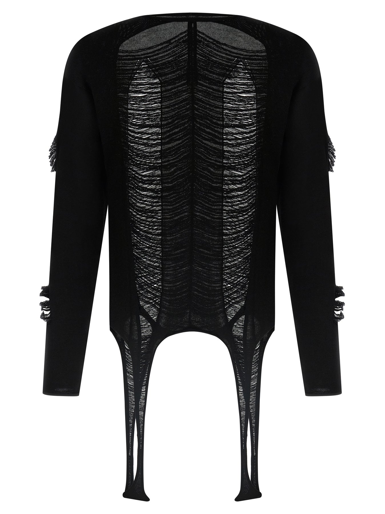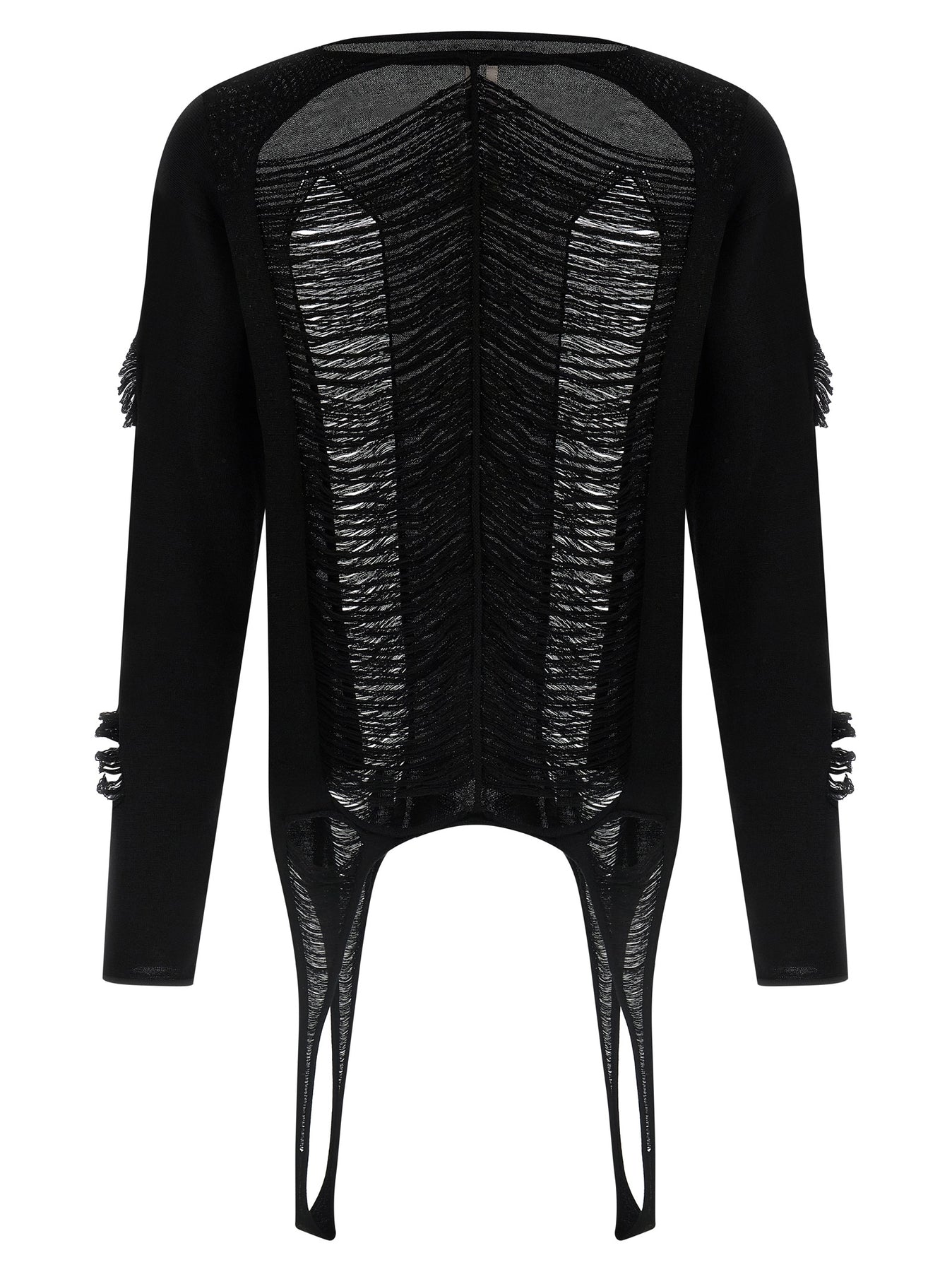 'LS Top' wool sweater with fraying and cut-out details on the front and back, boat neck, long sleeves, raw cut hem.