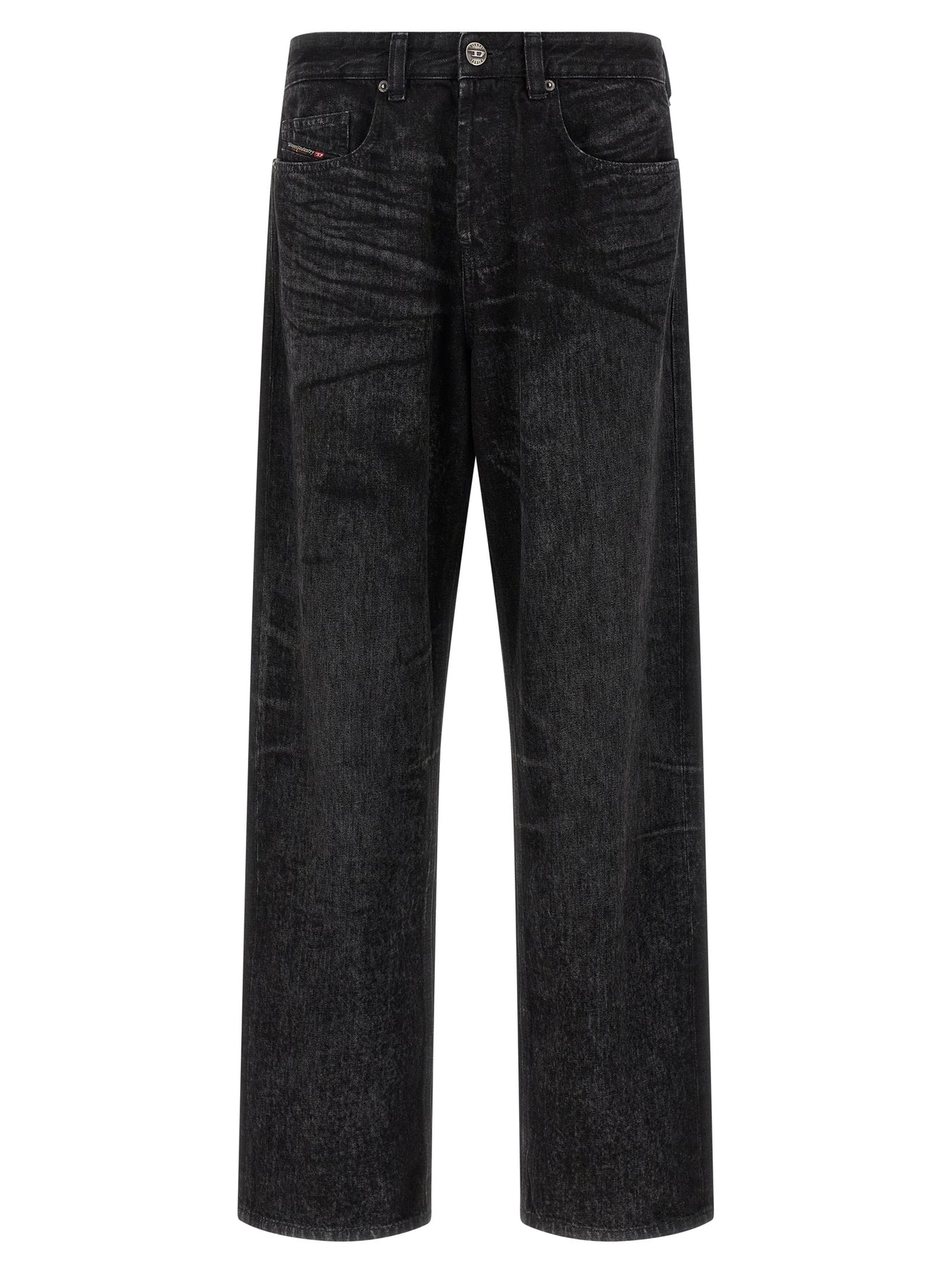 '2001 D-Macro-Fsh' stonewashed cotton and hemp denim jeans, low waist, wide leg, five pockets, front button closure, back logo tag.
