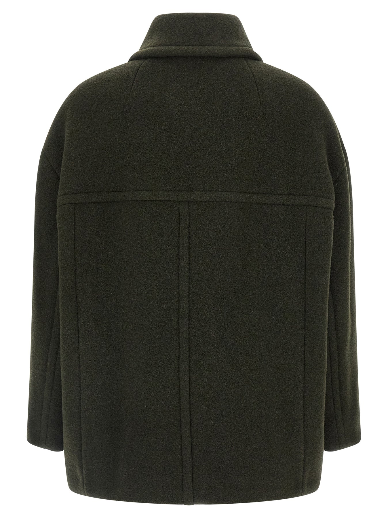 'Fiby' double-breasted short wool blend coat with front button closure, shirt collar, pockets, long sleeves, monogram satin lining.