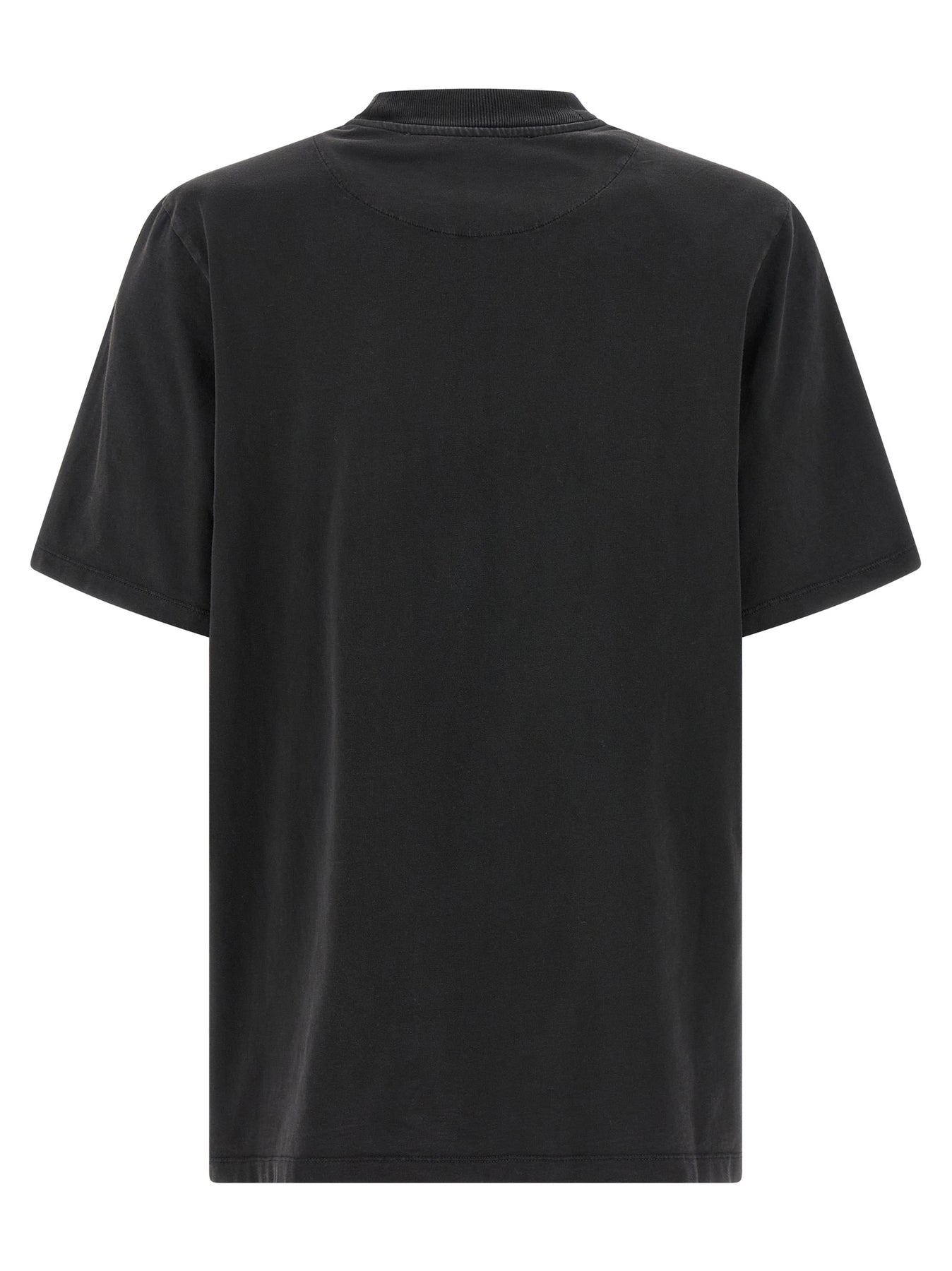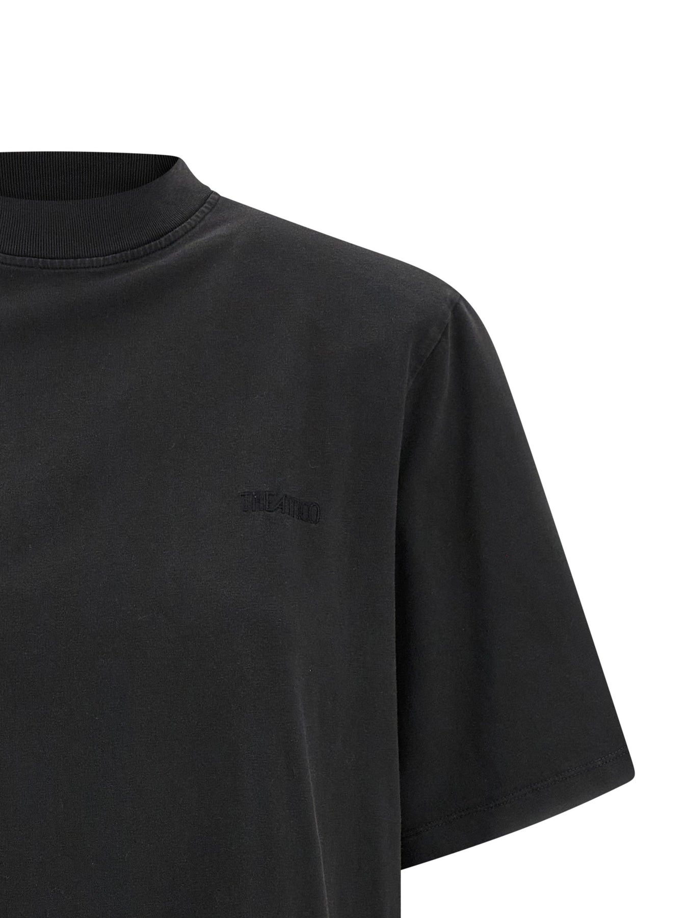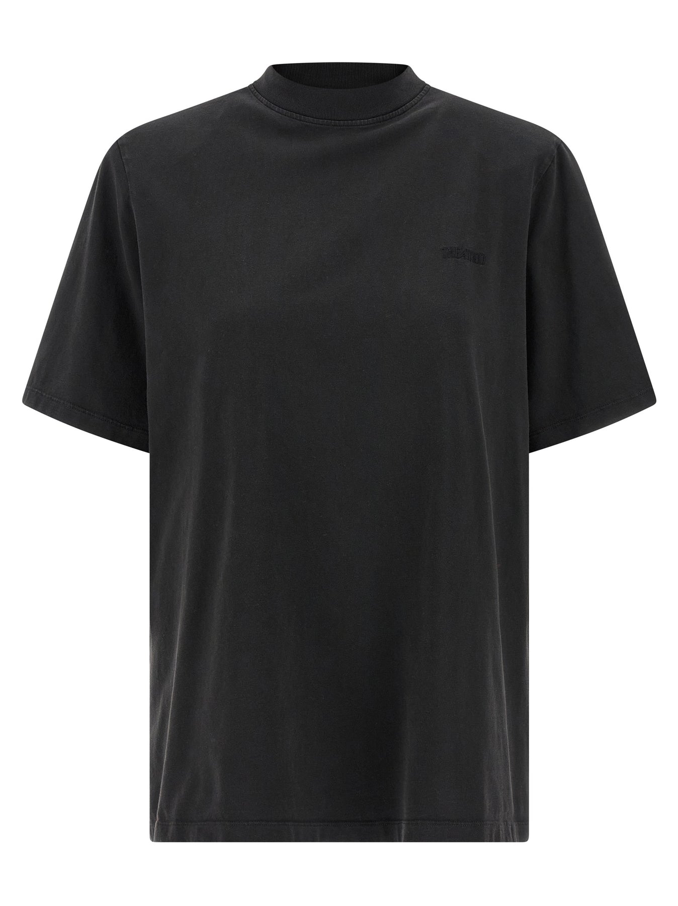 Faded cotton jersey t-shirt with tone-on-tone logo embroidery on the front, removable padded shoulder, short sleeves with dropped shoulders.
