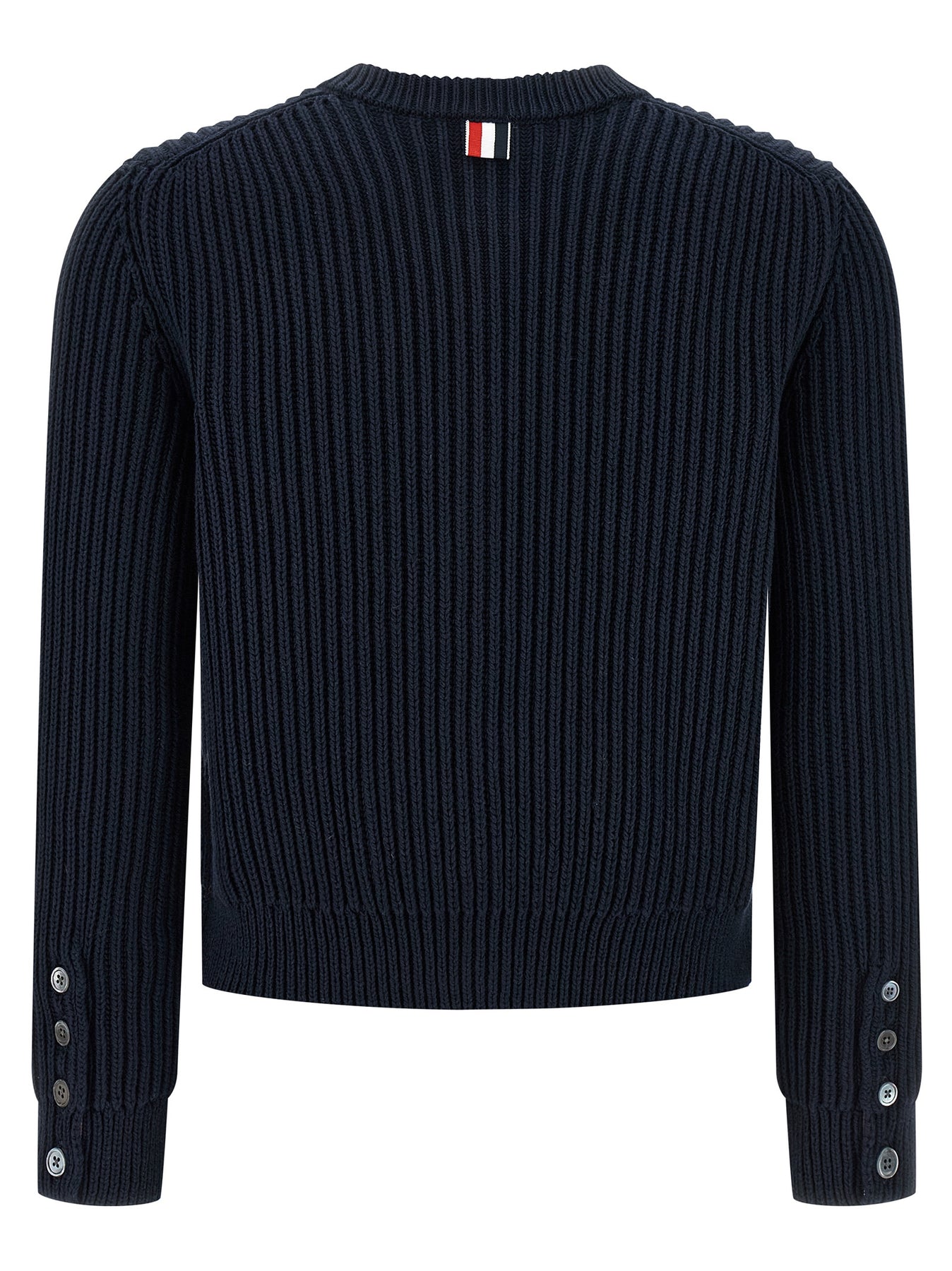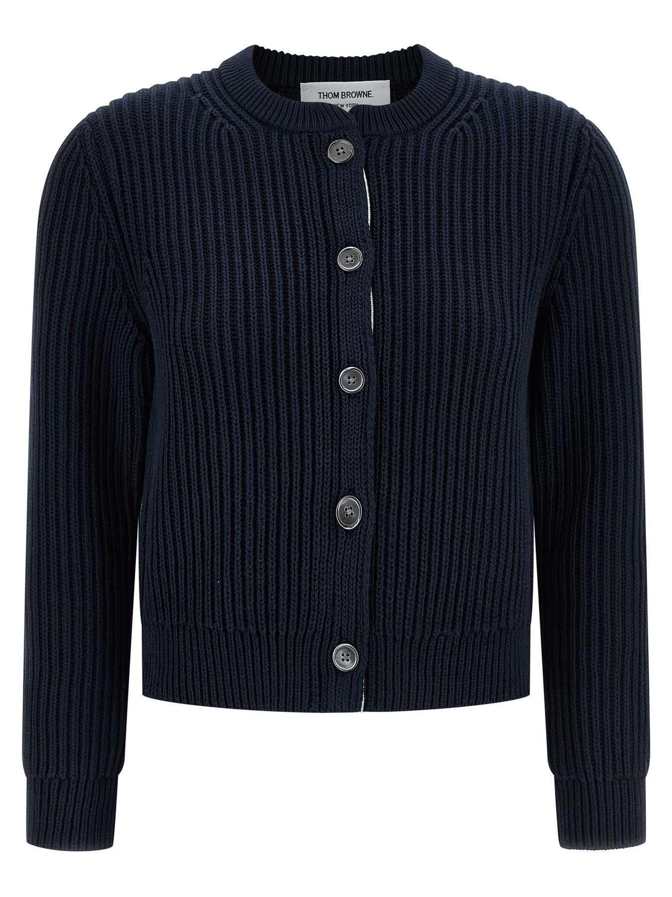 Knitted cotton cardigan, crop model, crew neck, front button closure with RWB grosgrain tape lining, long cuffed sleeves.