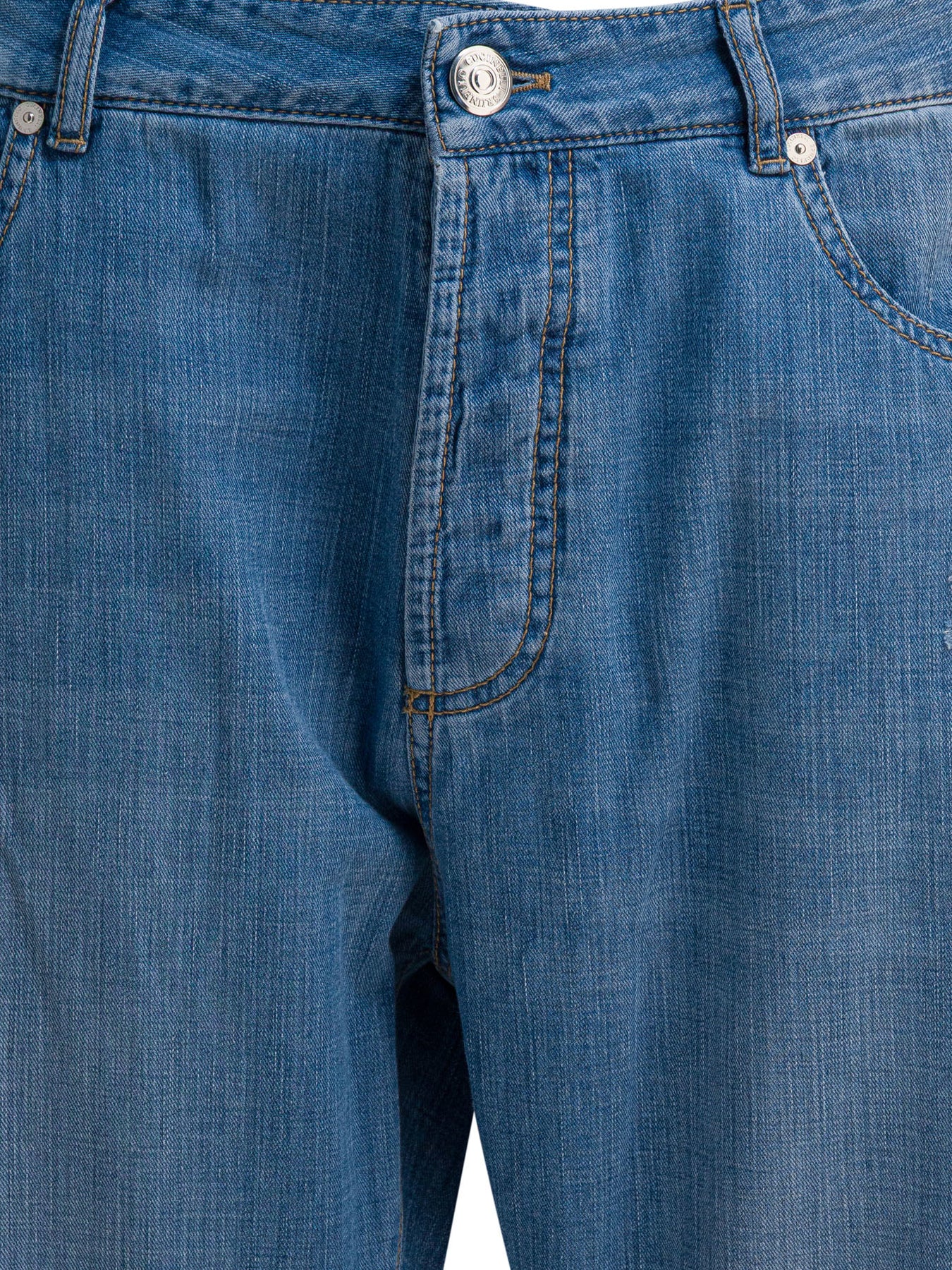Brunello Cucinelli five-pocket leisure-fit jeans in lightweight Japanese cotton denim. The breaks present along the leg are handmade and each garment features slightly different details. The structure provides an ergonomic silhouette with a soft pelvis and tapered leg. The dyeing process carried out on the finished garment generates tonal variations that are particularly visible on edges and seams. Metal button closure. || - Lightweight Japanese cotton denim - Medium waist - Handmade breaks - Metal button closure - Front pockets with breast pocket - Back patch pockets - Regular fit