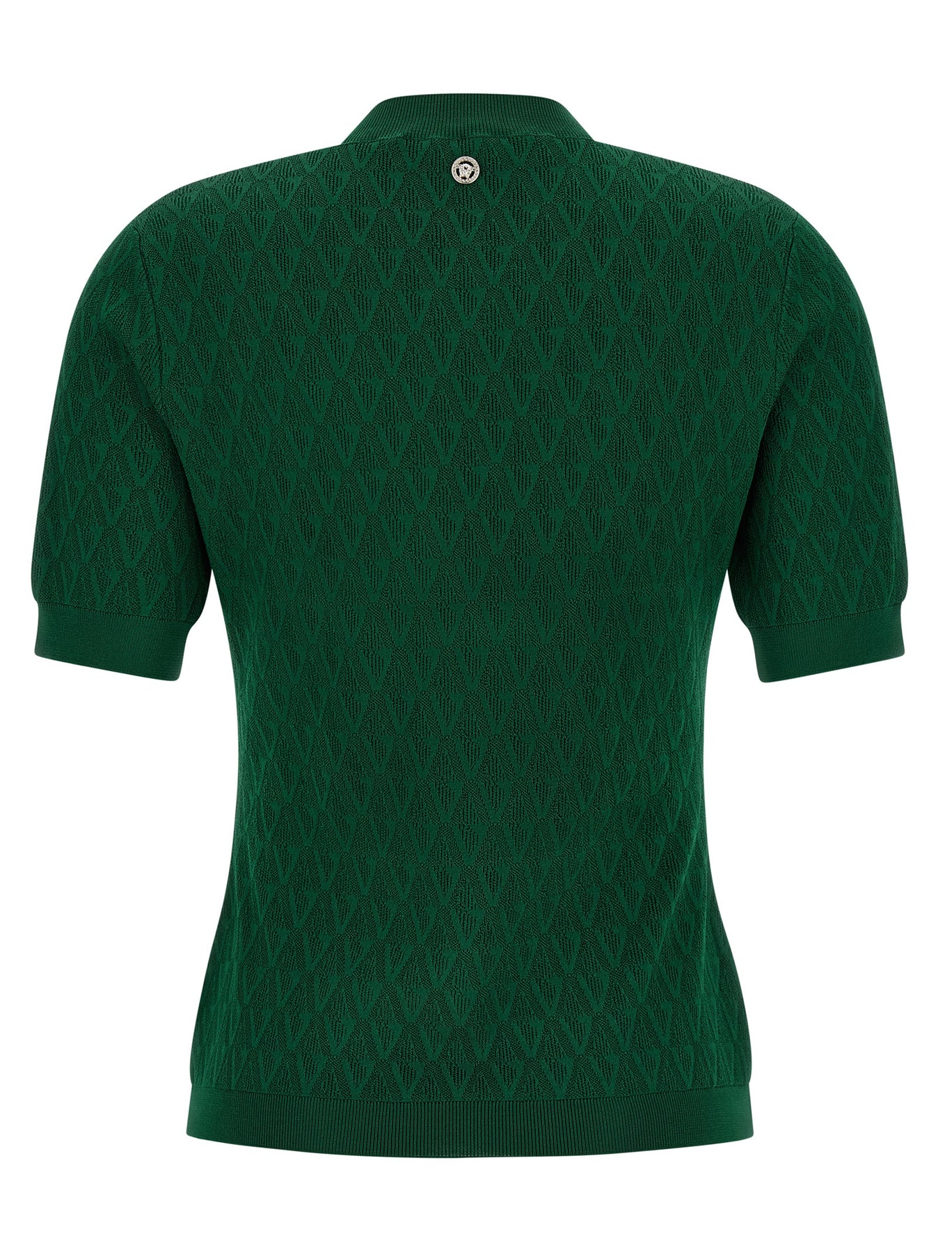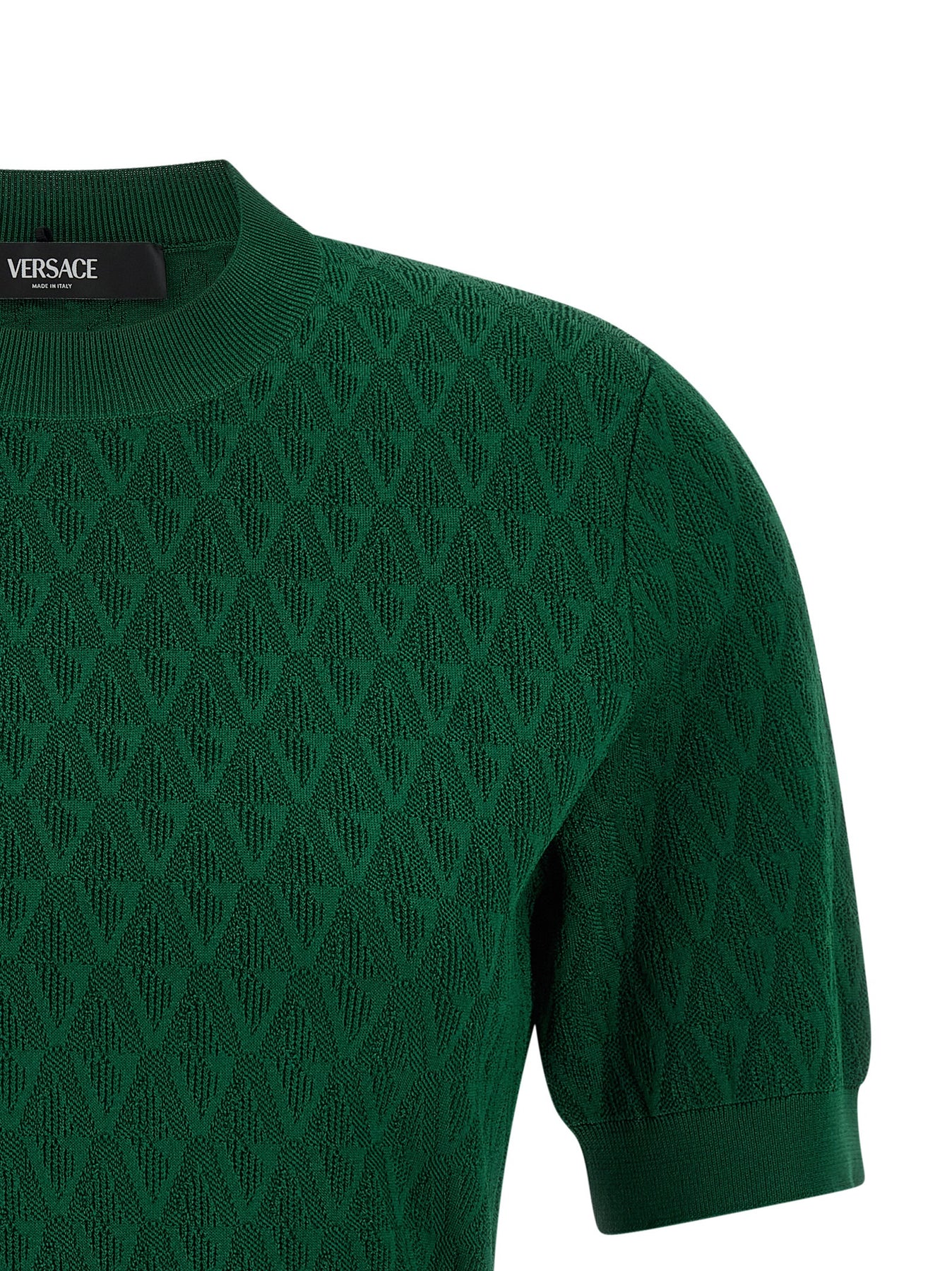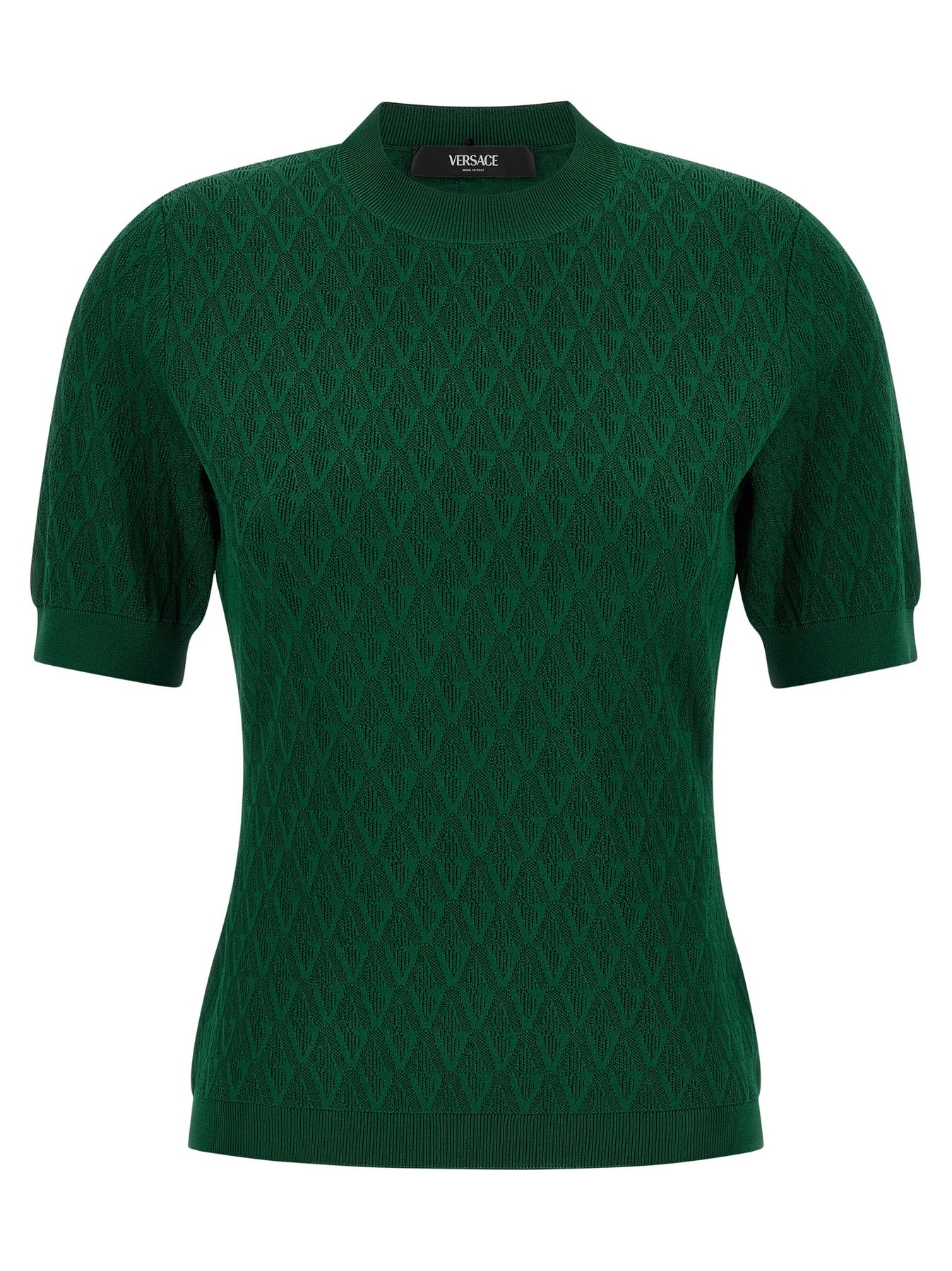 Stretch viscose knit T-shirt with all-over jacquard V pattern, metallic ‘Medusa’ logo on the back, crew neck, short sleeves.
