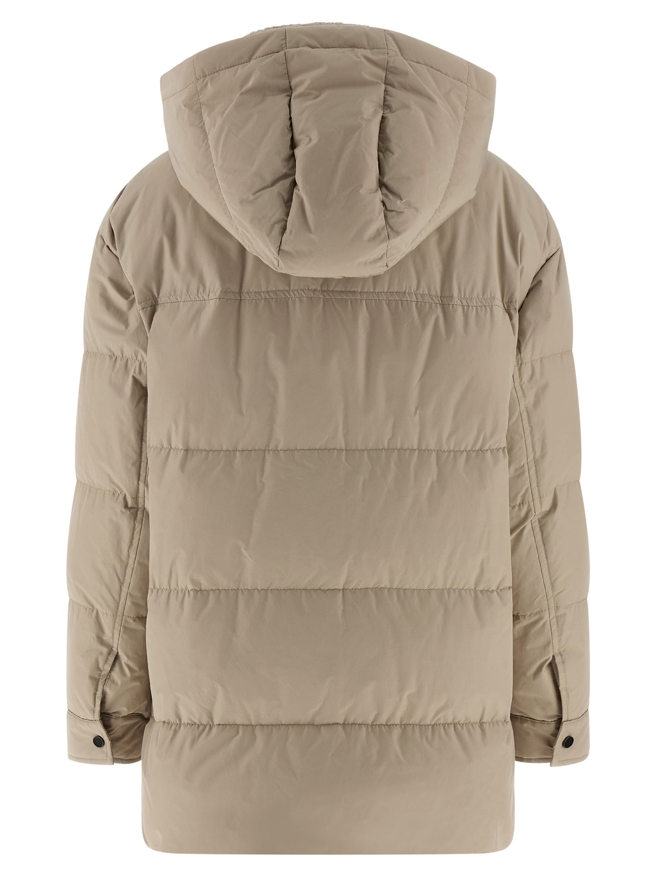 Quilted padded tech fabric down jacket, removable hood, high neck with crochet knit insert, front zip and snap button closure, pockets, long cuffed sleeves, side slits with zip closure.