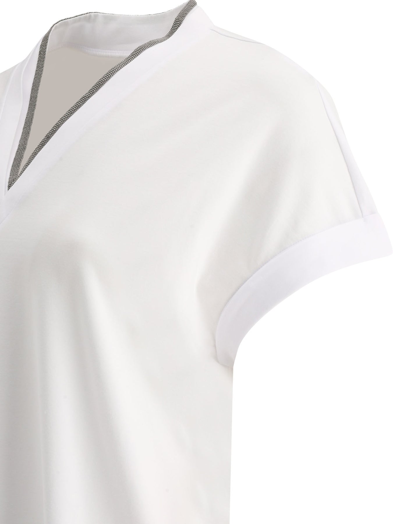 Brunello Cucinelli T-shirt with Shiny Contour, made of cotton with elastane component, features a lightweight construction with a straight silhouette. The design features a V-neckline, finished with Shiny Contour detail applied along the hem. The construction features clean seams and regular edges that contribute to the linearity of the shape. Sleeves are fitted with a short cut that maintains the classic fit. || - Solid color - Short sleeves - V-neckline - Shiny Contour detail applied on the neckline - 93% cotton, 7% elastane - Regular fit