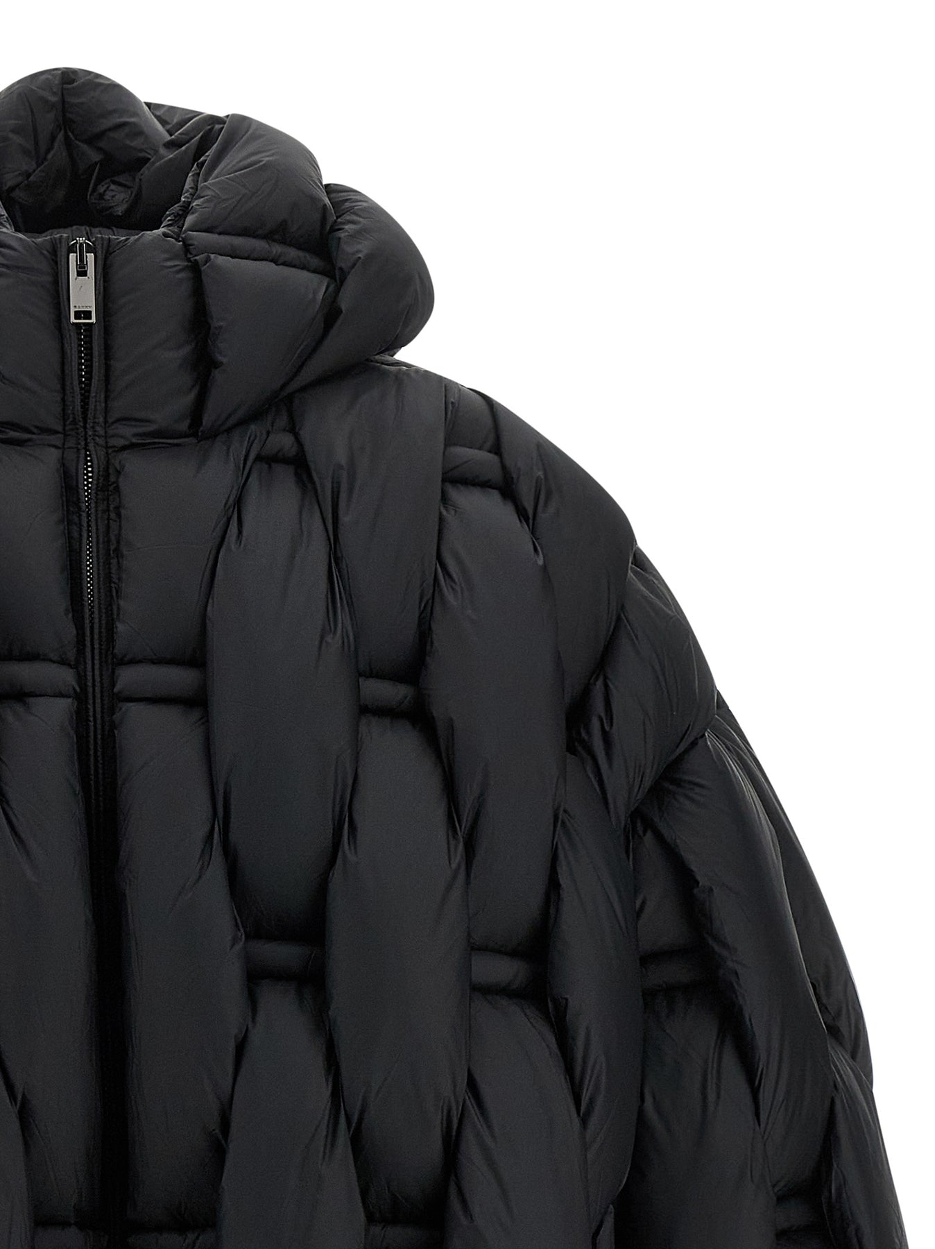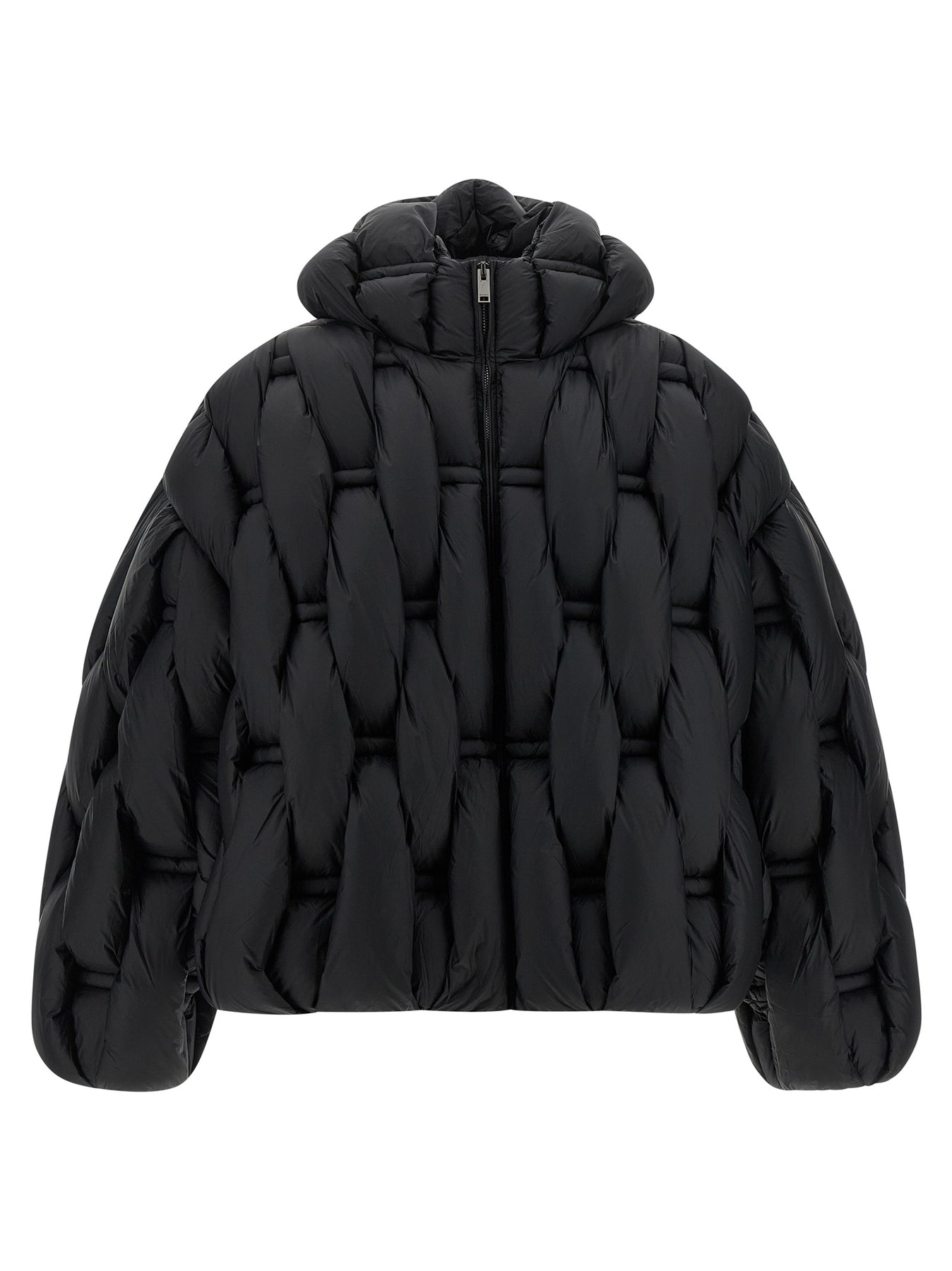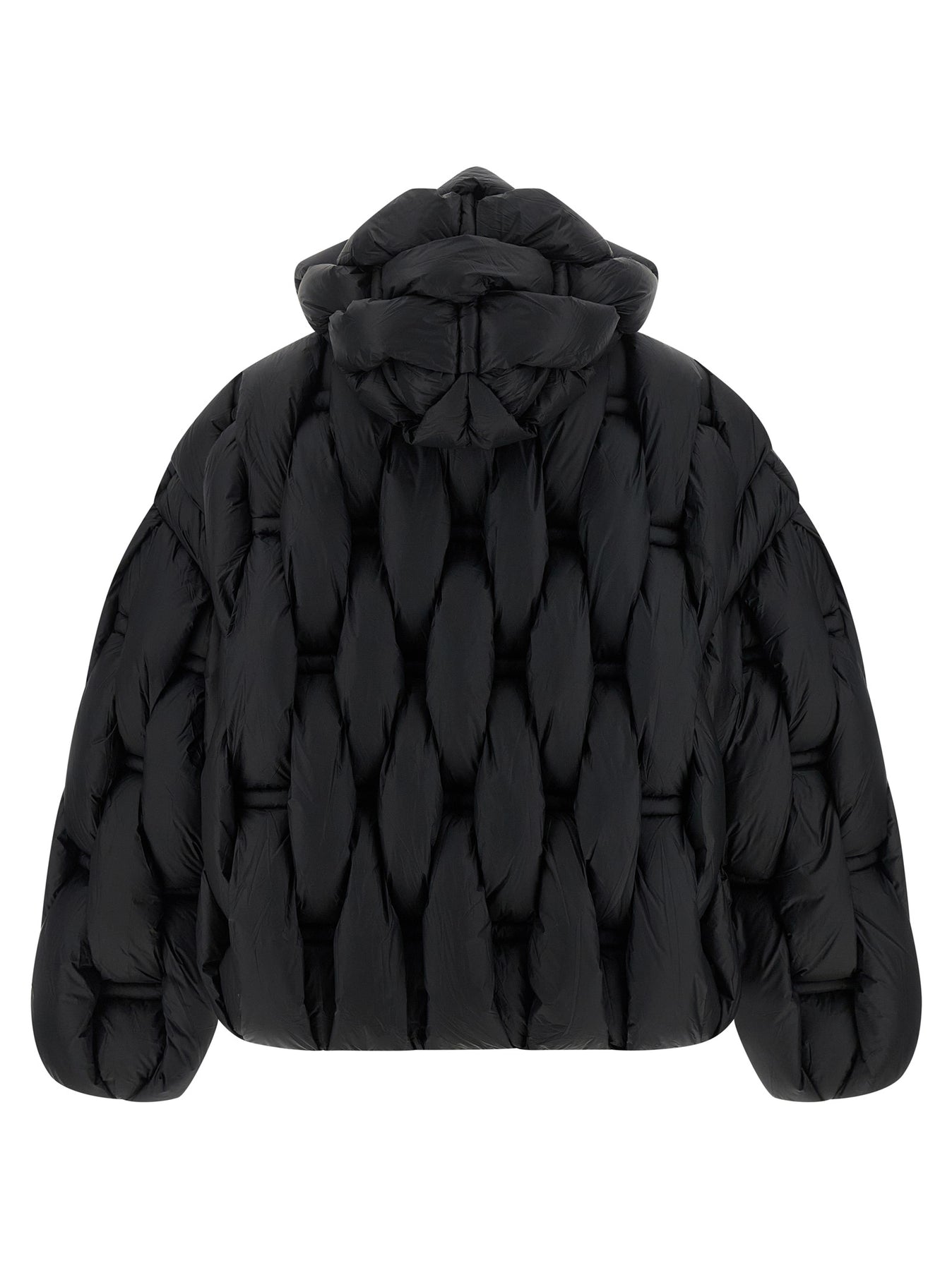 Nylon down jacket with braided 3D structure and goose feather padding, hood, high neck, front zip closure, pockets, long sleeves with cuffs and dropped shoulder, drawstring on the hem.
