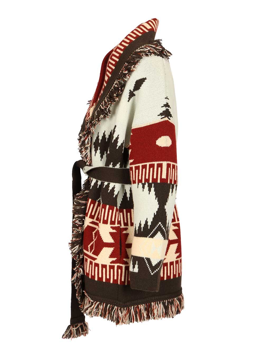 Icon cardigan in cashmere with double jacquard workmanship, dressing gown style with shawl neckline and frayed edges, long sleeves, pockets, removable belt.
