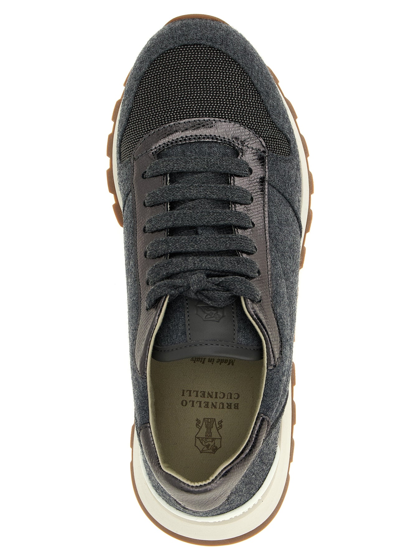 'Runners Precious Toe' melange wool sneakers with laminated leather details and Monile toe, lace-up closure and rubber sole.