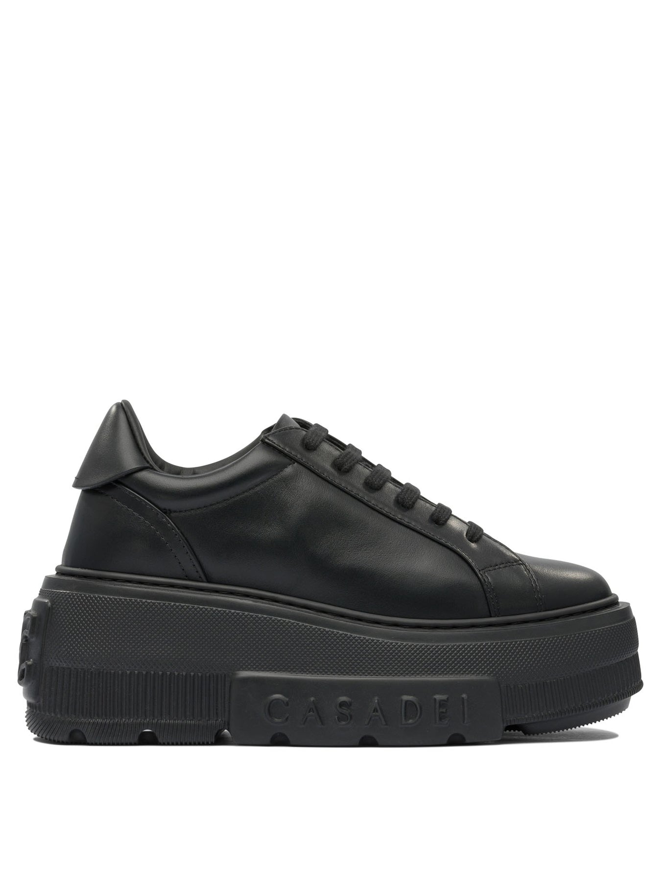 Casadei "Nexus" sneaker, made with leather upper and techno-futuristic bottom. The construction features an ultralight wedge integrated into the sole, characterized by a compact silhouette and sharp volumes. Applied to the side are the Maison's maxi logo and distinctive C-Chain detail. Structural inserts improve stability without changing the essential line. The fit is facilitated by the traditional closure. || - Leather upper - Ultra-lightweight wedge midsole - Side maxi logo detail - Distinctive C-Chain element - Embossed synthetic outsole