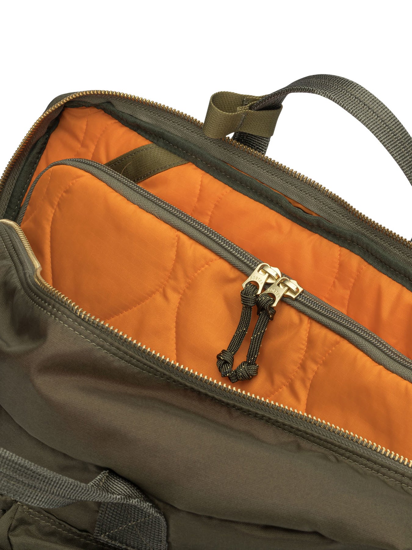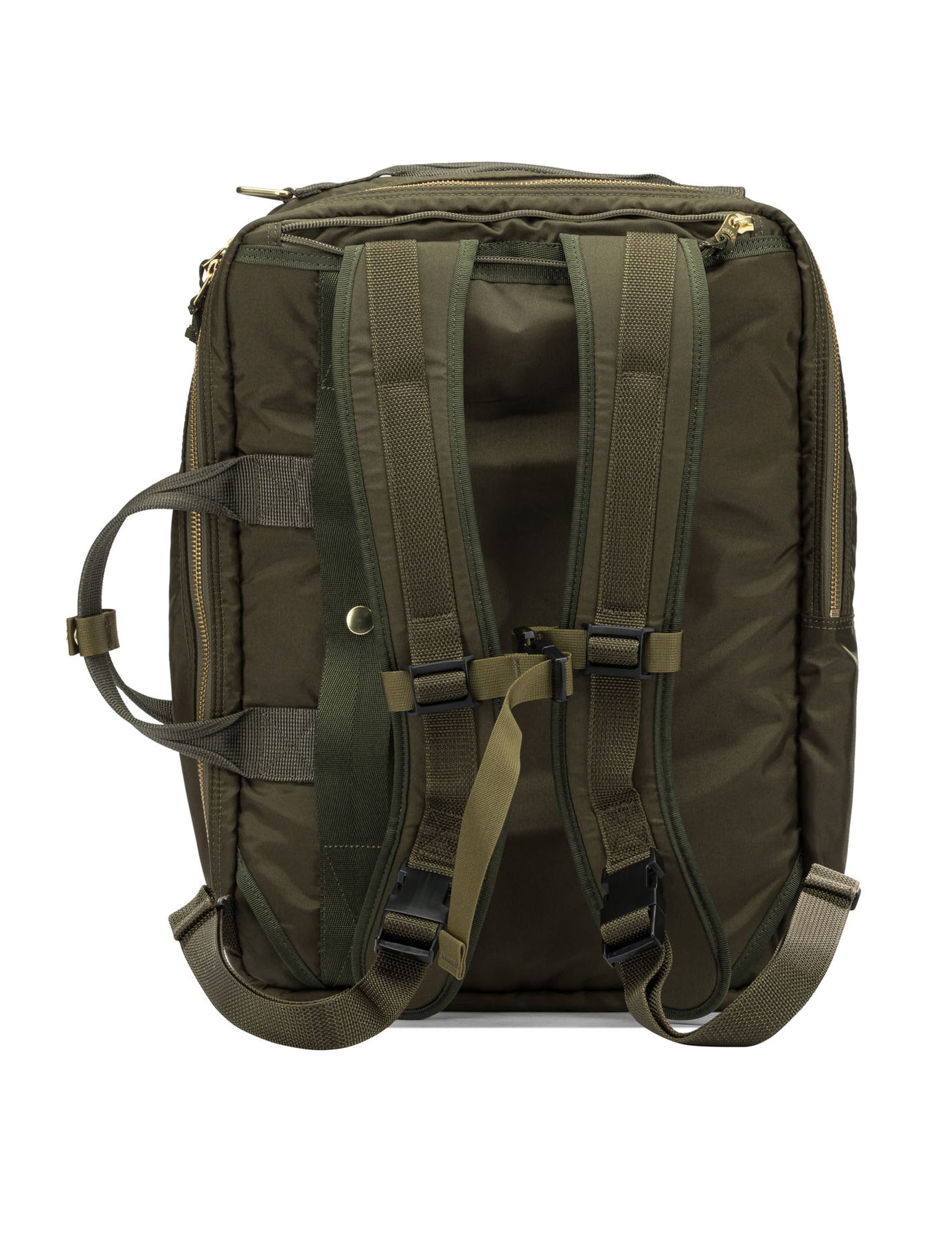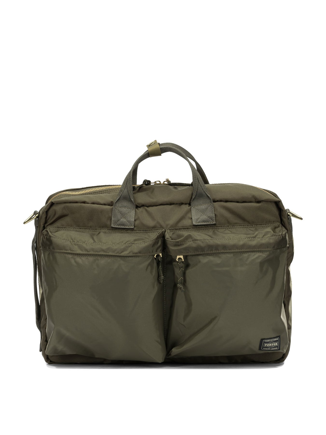 Porter-Yoshida & Co large "Force 3WAY" hand bag, made of 210-denier nylon 6, an industrial fabric woven with high-strength thread. The structure is semi-rigid, consisting of a square base and front compartments with fabric differences between the outer pockets and the main body. The rectangular silhouette features clean lines, nylon tape details of different types, and a removable inner pocket that can be used separately. || - 210-denier nylon exterior, industrial woven fabric - Quilted nylon ripstop interior, inspired by military jacket linings - Multiple nylon tape system applied at strategic points - Removable inside pocket that can be used as a clutch bag - Semi-rigid structure with squared-off base - Minimalist finishes