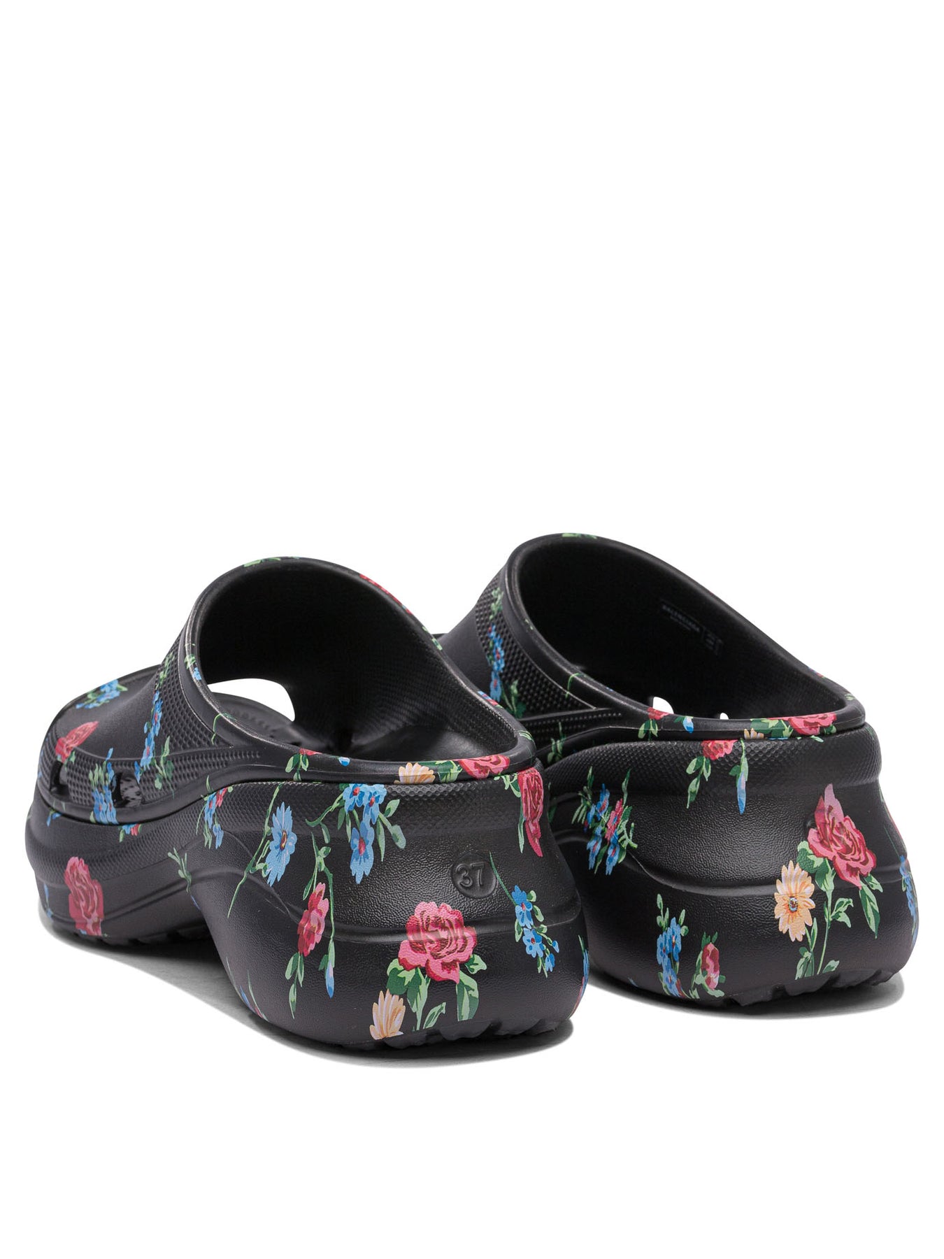 Balenciaga's "Pool Crocs™" Slides represent a combination of innovative design and everyday functionality. A product born from a collaboration with Crocs™, these shoes offer unparalleled comfort, designed for women who want to combine practicality and style in their everyday wear. Perfect for relaxed days, they stand out for their distinctive design that does not neglect the refined aesthetic typical of the Balenciaga brand. || - Made of EVA rubber - Open toe front - Embossed Balenciaga logo on the upper - Embossed cut-out on the back - Tone-on-tone sole and insole - Floral print - Eco-friendly product || These Slides, with their versatile design, can be paired with many looks for a balanced result. Perfect to wear with a long, light casual dress for a walk outdoors, or with soft pants for a mix of comfort and understated elegance. They add an innovative touch to any pairing, ensuring a modern and distinctive style.