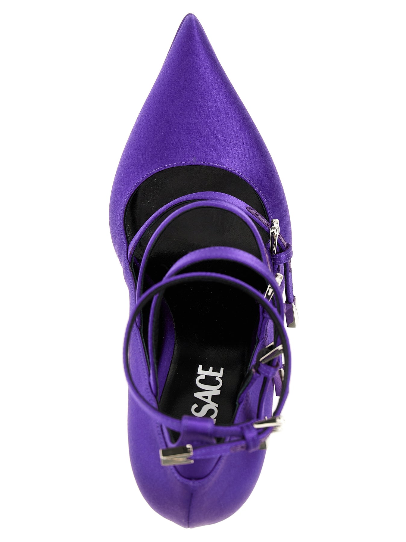 Tempest platform pumps in satin with pointed toe and heel, featuring a V-shaped metal detail on the straps with an adjustable buckle.