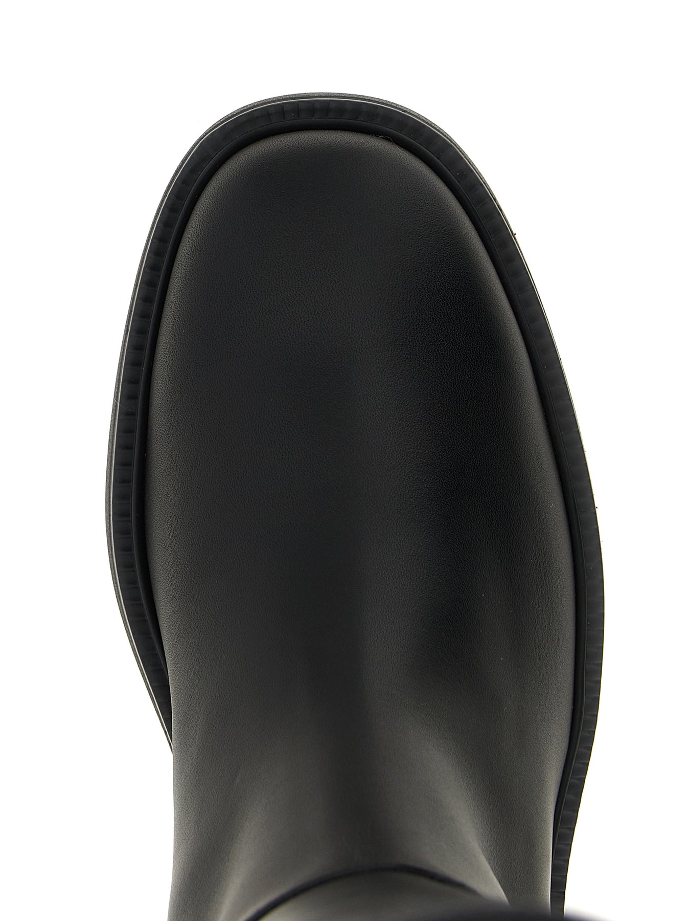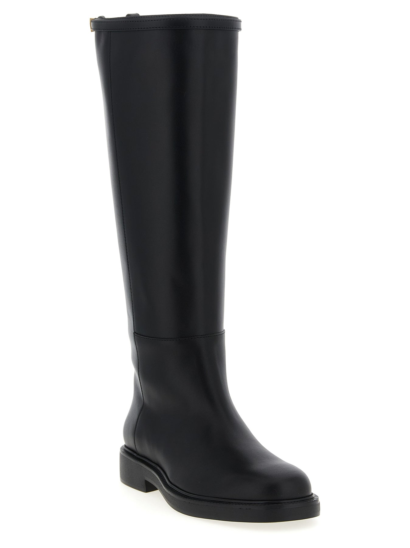 Leather boots, adjustable strap with metal 'T Timeless' detail, tubular leg, square toe, rubber sole.