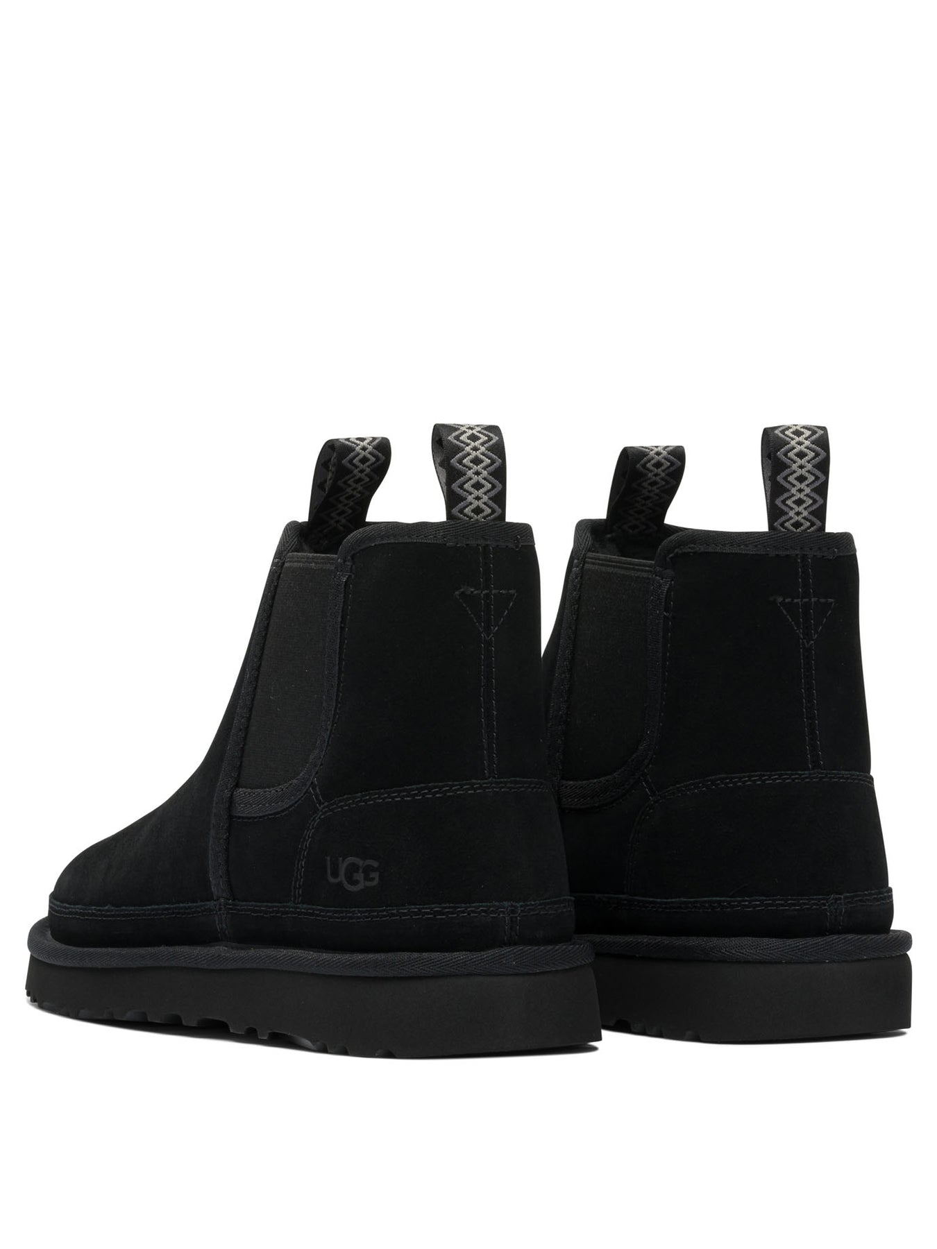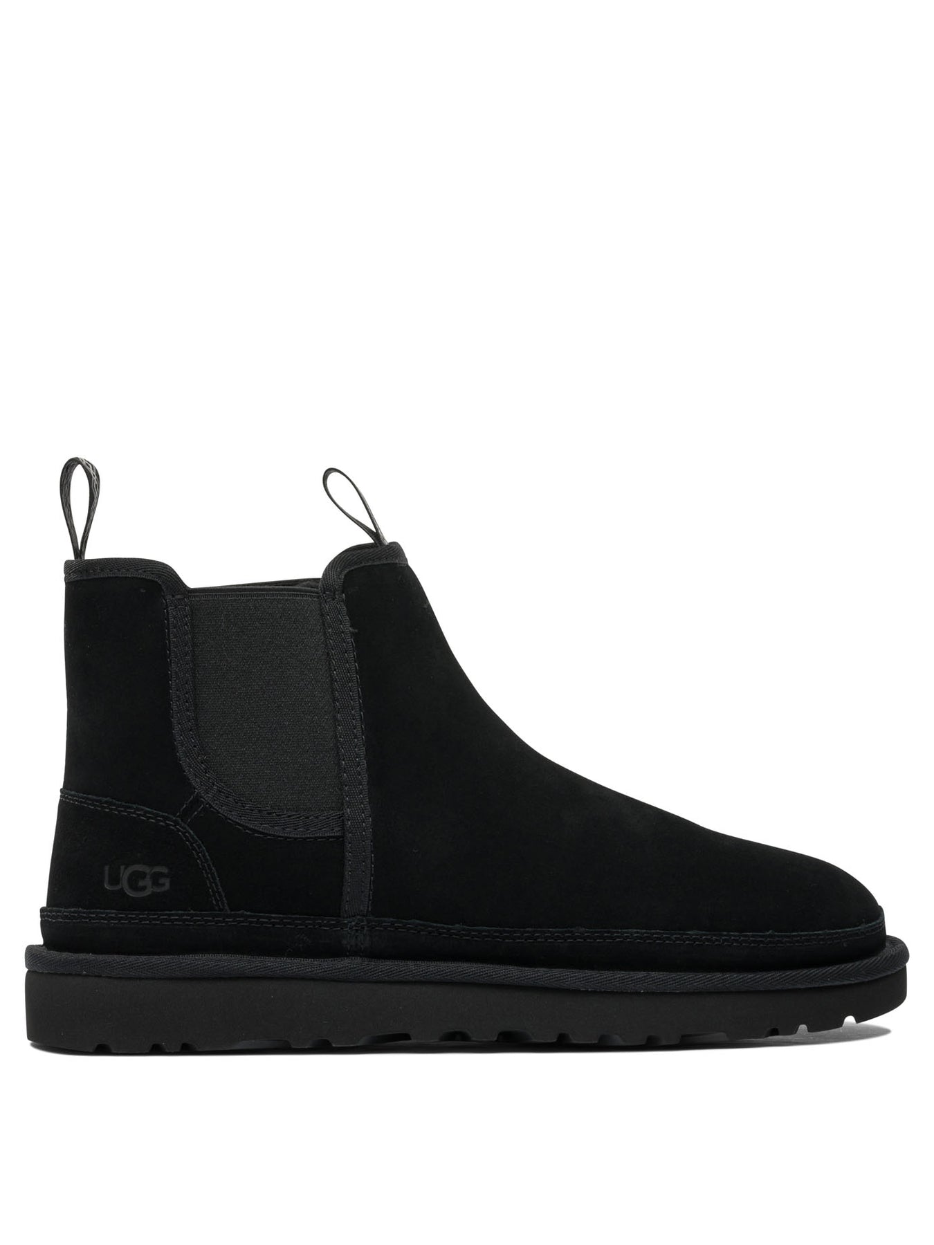 Ugg "Neumel" Chelsea boots, constructed with suede leather upper. They feature elastic insert on the sides and double pull-on construction, one in the front and one in the back, for easy donning. The inner lining and insole are made of 17mm UGGplush™, a fabric composed of regenerated wool and TENCEL™ lyocell. The EVA outsole offers lightweight, flexibility and wear resistance. The fabric border is made of recycled polyester fibers. || - Suede leather upper - Lining made of 17 mm UGGplush™ regenerated wool and TENCEL™ lyocell - Insole made of 17 mm UGGplush™, variable composition - Elasticized insert on both sides, front and back pulls - Woven edge with recycled polyester fibers (100%) - EVA outsole with options in cane or Treadlite by Ugg™