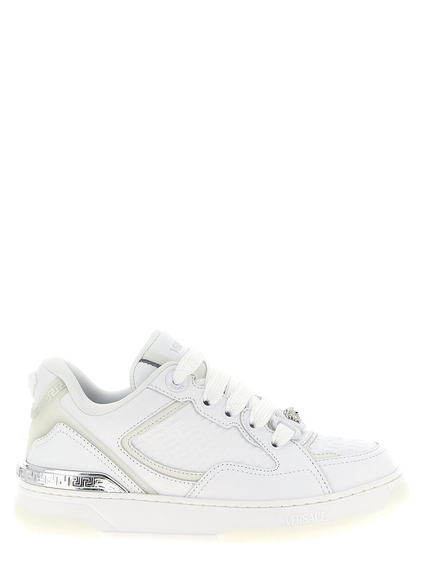'Biggie Basket' leather sneakers with high frequency Greca motifs, lace-up closure with 'Medusa Biggie' detail, back metal hardware, rubber sole.